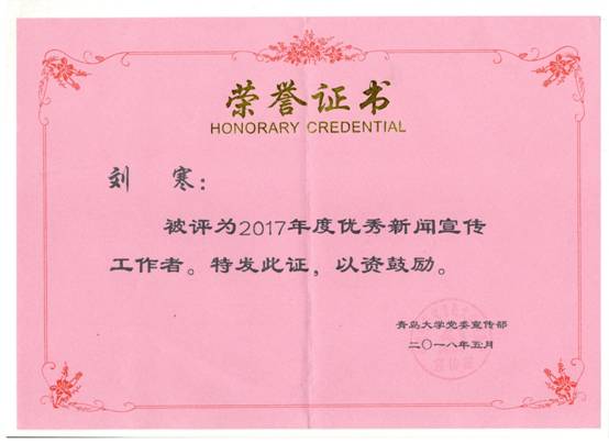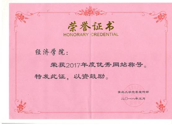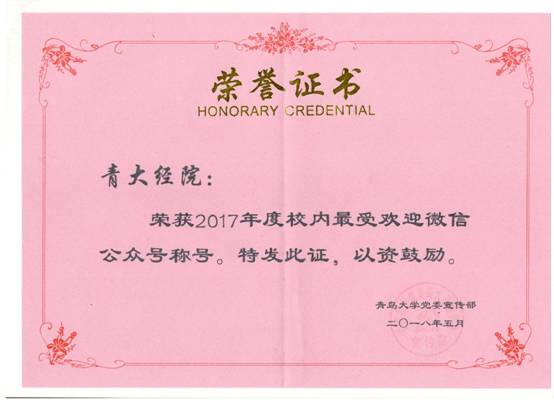 在5月9日上午召开的350vip8888新葡的京集团2018年度新闻宣传工作会议上,新葡的京官网荣获校2017年度新闻宣传工作先进单位,学院网站被评为学校2017年度优秀网站,“青大经院”微信公众号被评为2017年度校内最受欢迎微信公众号,刘寒同志被评为2017年度优秀新闻宣传工作者。
