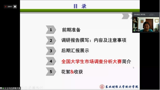 9月4日下午,国家社会科学基金重大项目首席专家孙玉环教授为全校师生200多人,在线上做了题为“‘市场调查与分析大赛’指导团队参赛经验分享”的高端讲座。