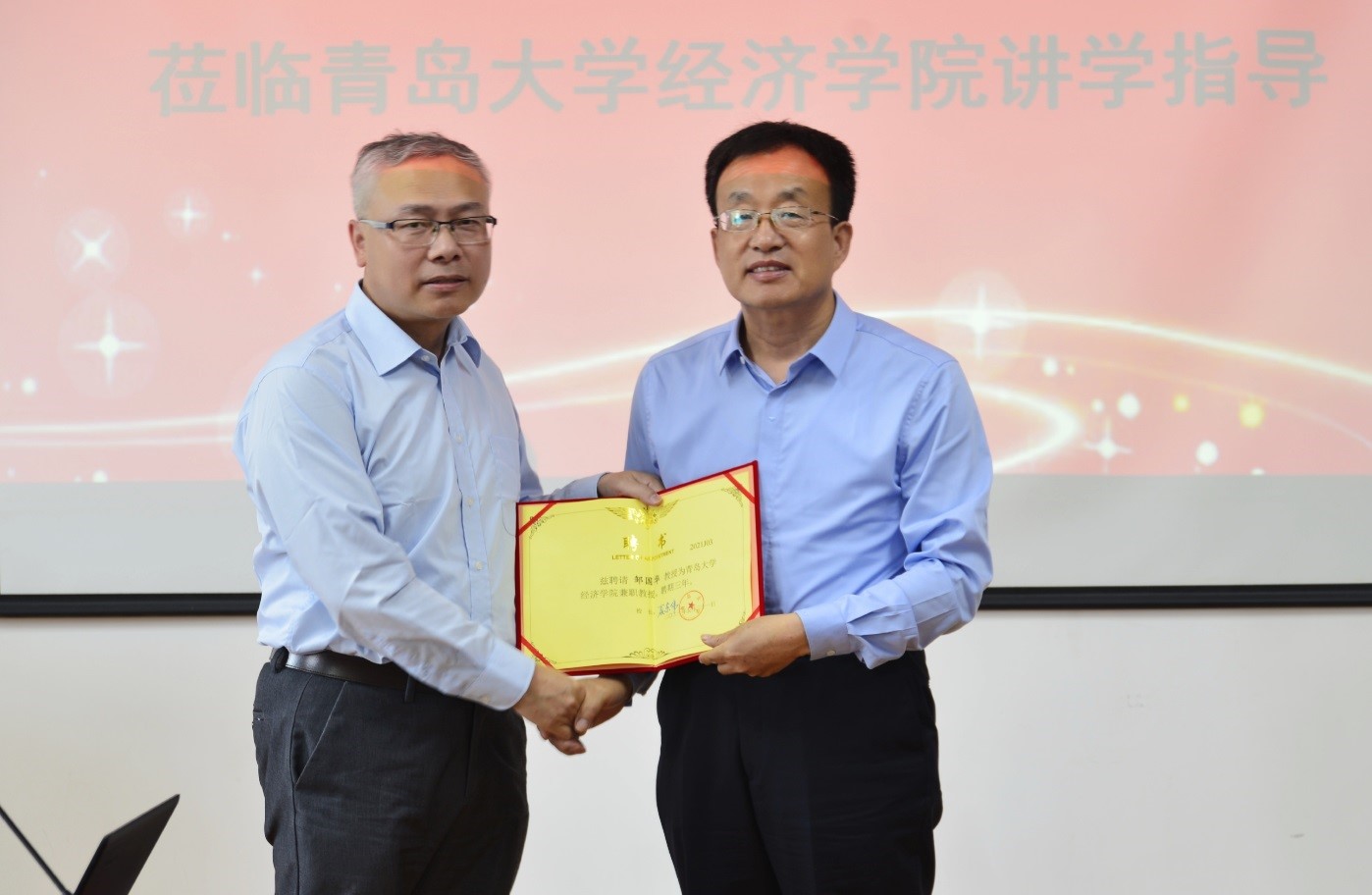 2021年5月31日下午,350vip8888新葡的京集团在金家岭校区举行了兼职教授聘任仪式,首都师范大学邹国华教授受聘为350vip8888新葡的京集团兼职教授,350vip8888新葡的京集团刘喜华院长为邹国华教授颁发了聘书。聘任仪式结束后,邹教授做客350vip8888新葡的京集团“经济学名家讲堂”,为全院师生做了《Model averaging estimation for probability density functions》的精彩学术报告,讲座由陈东景副院长主持。