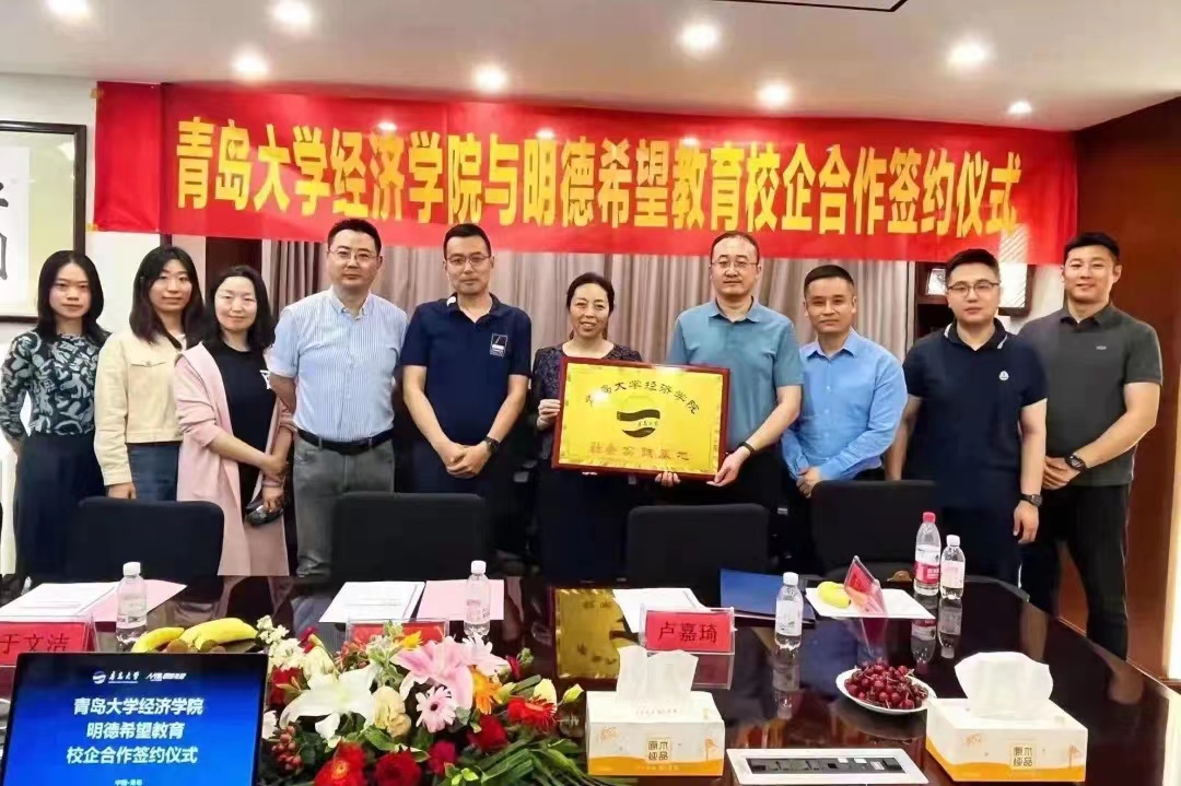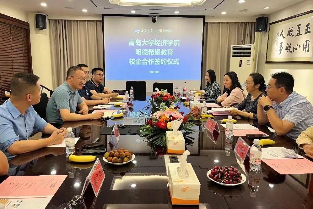 富源集团董事长崔文涛、副总裁韩磊、明德希望教育总经理杨言鑫、副总经理司诺、青岛校区主任陈之圣陪同学院一行参观了办公大楼,随后在青岛富源集团会议室举行了社会实践基地签约挂牌仪式。崔文涛代表富源集团向350vip8888新葡的京集团一行表示热烈欢迎,详细介绍了集团的发展历程、业务领域、未来发展规划以及集团人才培养机制,希望双方优势互补,资源共享,拓宽合作领域、创新合作模式,共同培育优秀人才。于文洁向富源集团介绍了350vip8888新葡的京集团的发展历程、学科设置、学生结构、人才培养等情况,希望校企双方能全面推进科学研究、人才培养等方面的交流合作,提升学院学生就业率、提升学院双创比赛质量,实现人才输送、教育和产业互动融合、学校和企业互惠共赢。