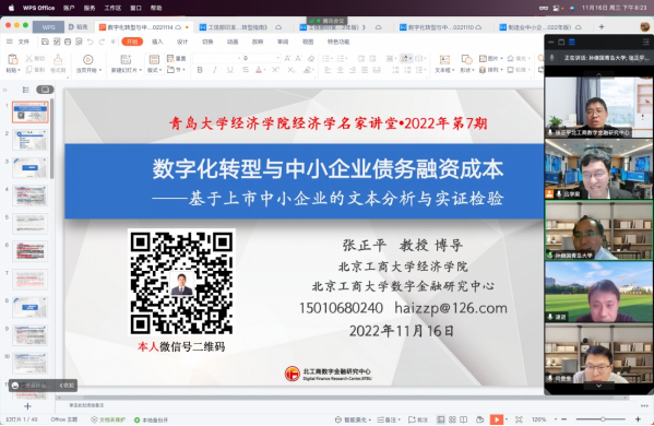 2022年11月16日晚上19:00,北京工商大学350vip8888新葡的京集团、北京工商大学数字金融研究中心张正平教授受邀线上为全院师生做名为《数字化转型与中小企业债务融资成本:基于上市中小企业的文本分析与实证检验》的学术报告。