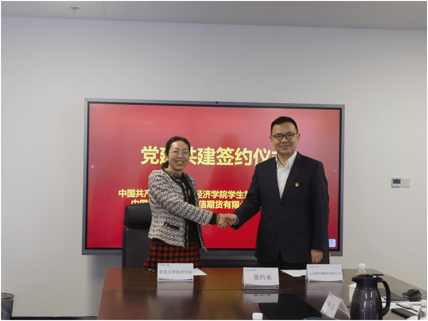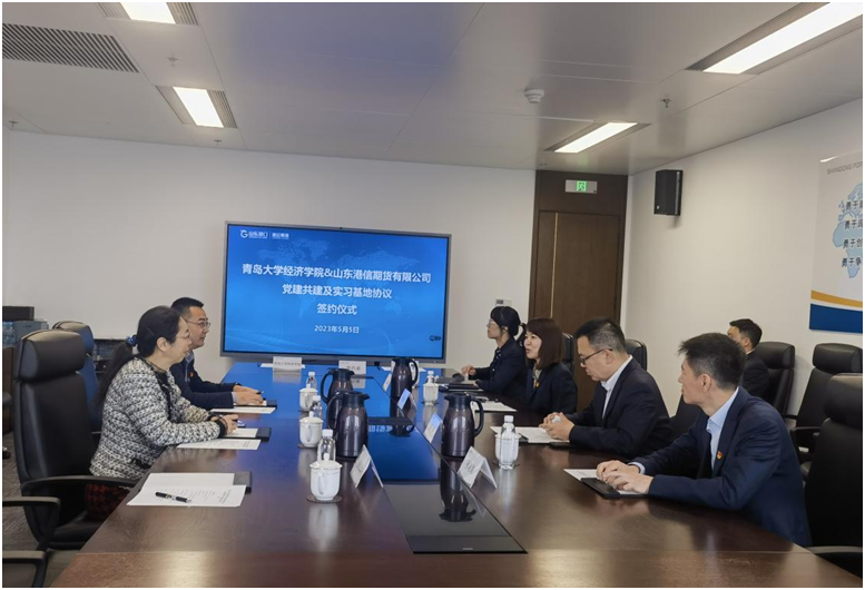 山东港信期货有限公司党支部书记、财务总监强帅,副总经理周玉梅,综合管理部副经理金玉,青岛分公司总经理孙培龙陪同学院一行参观了办公环境,介绍了企业的发展历程和企业文化,随后在港信期货大会议室举行了党建共建及实习基地协议签约仪式。