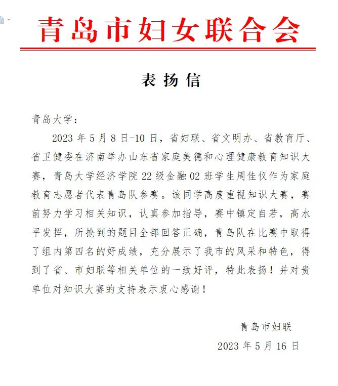 近日,省妇联、省文明办、省教育厅、省卫健委在济南举办山东省家庭美德和心理健康教育知识大赛,新葡的京官网2022级金融02班学生周佳仪作为家庭教育志愿者代表青岛队参赛。最终,青岛队在比赛中取得了组内第四名的好成绩,周佳仪同学得到了青岛市妇联的表扬信。