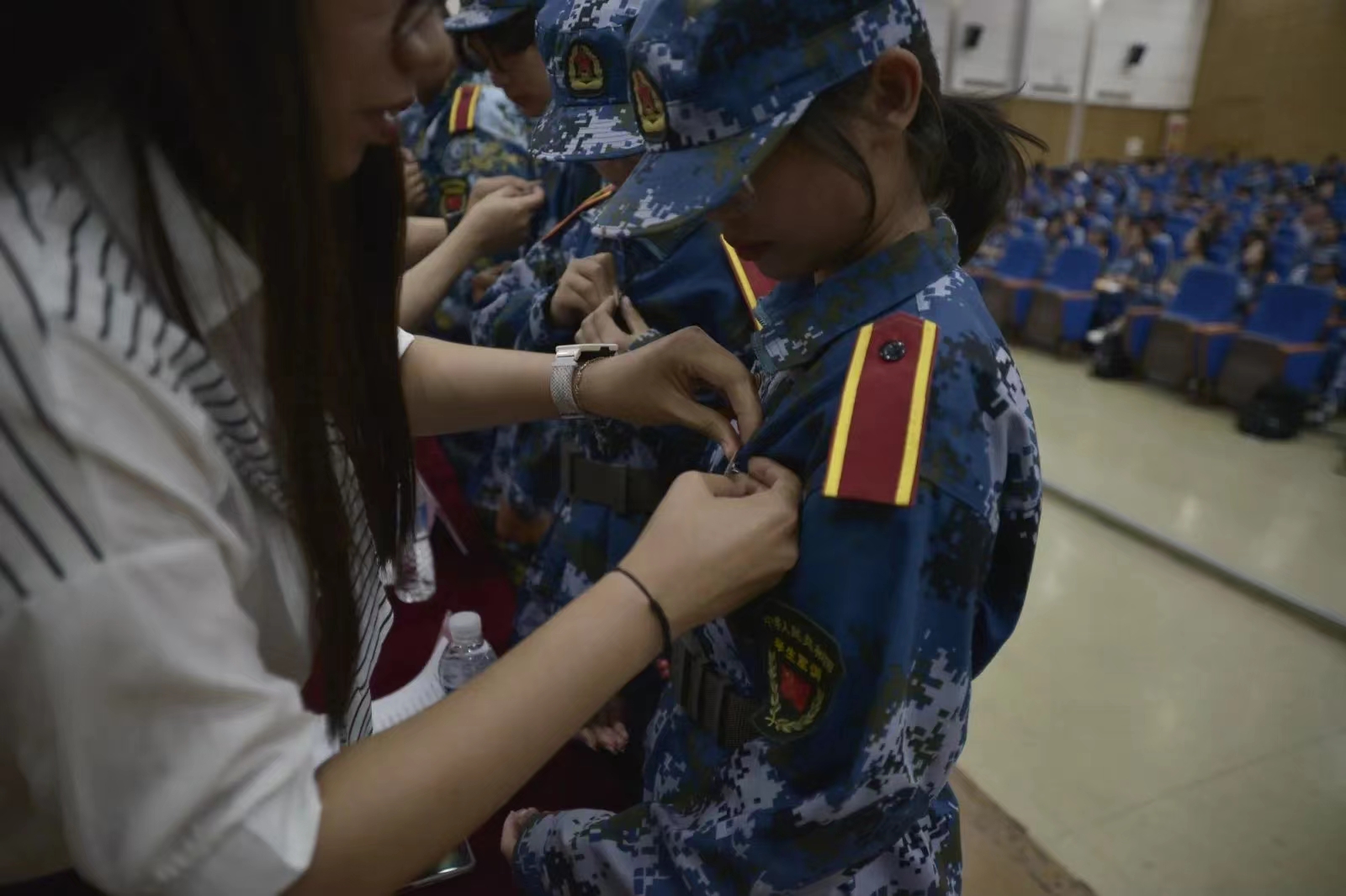 在领导、老师们的见证下,学院教师为新生代表佩戴校徽。新生将校徽佩戴在胸前那一刻起将与青大血脉相连。新青大人,将承载着青大经院的期望与重托,在前行道路上发扬“经世济民”的经院学子风采。