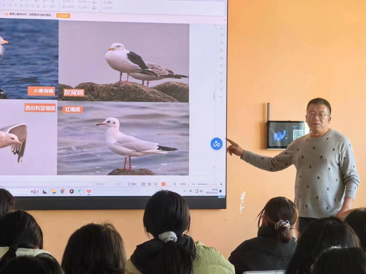 薛琳长期致力于生态保育与生态教育公益事业,他从青岛野生鸟类及鸥类的资源状况、青岛鸥类的分布及重要栖息地、青岛观鸥的注意事项等三方面入手,以通俗的语言、丰富的观鸟经验,向师生们详细介绍了当下海鸥的生存现状,强调保护海鸥的重要性,从四个季节分别向师生们介绍了海鸥的生存习性,细致入微地讲解了海鸥与人类间的动人故事,为师生们带来一场生动的鸟类知识盛宴。