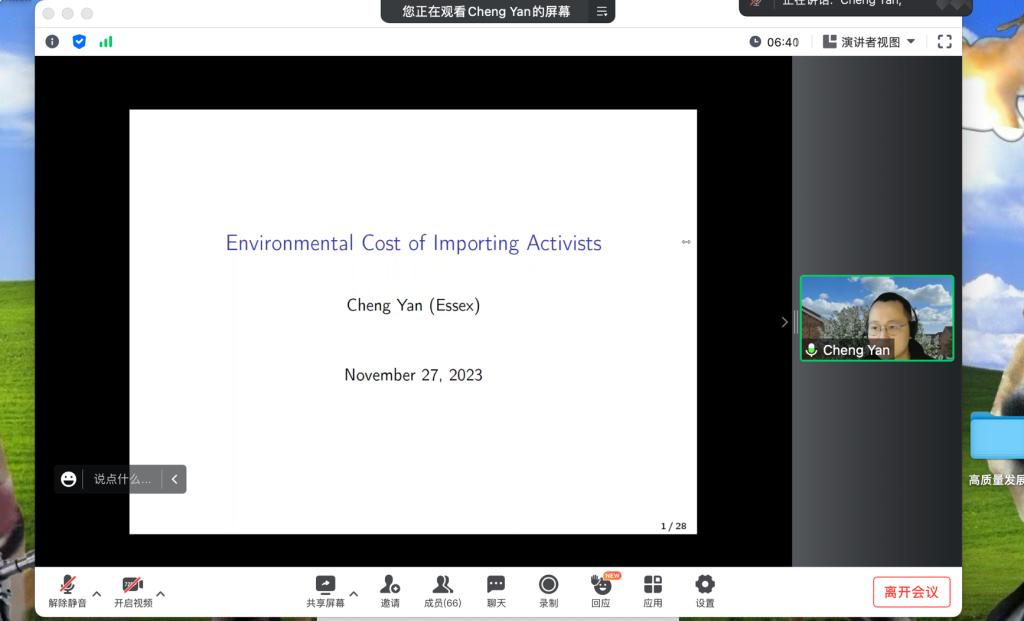 2023年11月27日下午19:00,University of Essex副教授,博导,卡斯商学院新兴市场集团研究员颜诚,通过腾讯会议线上为350vip8888新葡的京集团师生做了题为《Environmental Cost of Importing Activists》的学术报告。讲座由350vip8888新葡的京集团副院长吕学梁主持,学院70余名师生参与了此次学术交流活动。