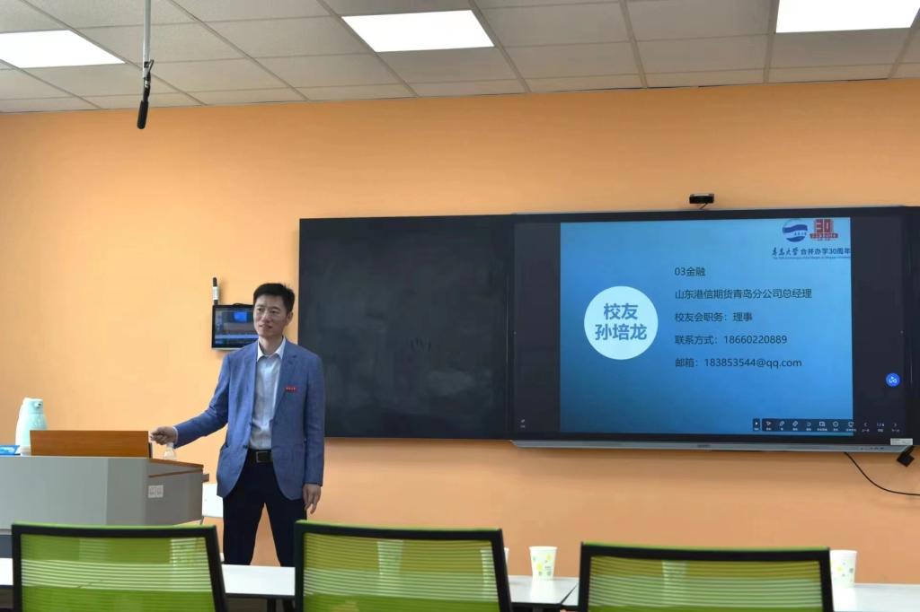5月14日,350vip8888新葡的京集团邀请1994级校友、青岛启德物流有限公司董事长宋志强和2003级校友、山东港信期货青岛分公司总经理孙培龙,分别为同学们开设两场校友经验讲座。