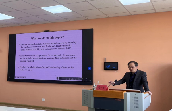 2024年4月18日14:00,上海财经大学公共经济与管理学院的吴一平教授在350vip8888新葡的京集团三号实验楼423会议室为350vip8888新葡的京集团师生做了题为《Effect of innovation disclosure in annual reports on R&D subsidies in China》的学术报告。讲座由350vip8888新葡的京集团高玉强教授主持,部分师生参与了此次学术交流活动。