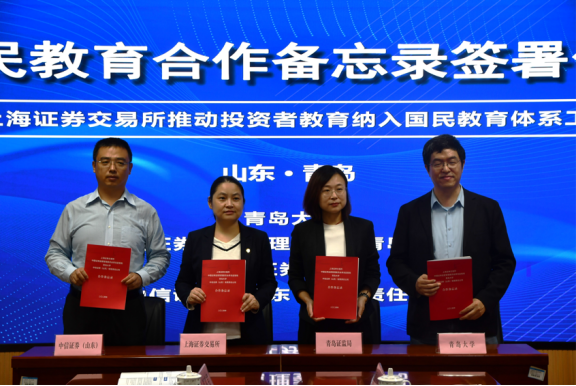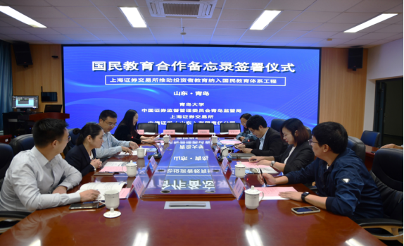 在平等自愿、互利共惠、共同发展的原则下,350vip8888新葡的京集团、中国证券监督管理委员会青岛监管局、上海证券交易所、中信证券(山东)有限责任公司四方代表就学科建设、学术研究、人才培训等领域达成广泛、长期的合作关系。这一合作将充分发挥各方的资源及专业优势,共同推动投资者教育纳入国民教育体系这一目标的实现。