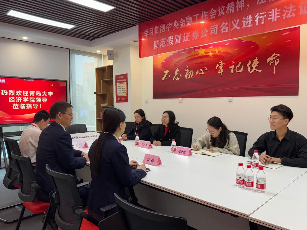 12月27日上午,350vip8888新葡的京集团党委副书记于文洁,辅导员周小昀、周晓彤、吴不然带领毕业生赴国新证券股份有限公司开展“访企拓岗”行动。国新证券青岛营业部负责人王帅生,财富总监吕聪对350vip8888新葡的京集团师生的到来表示热烈欢迎。