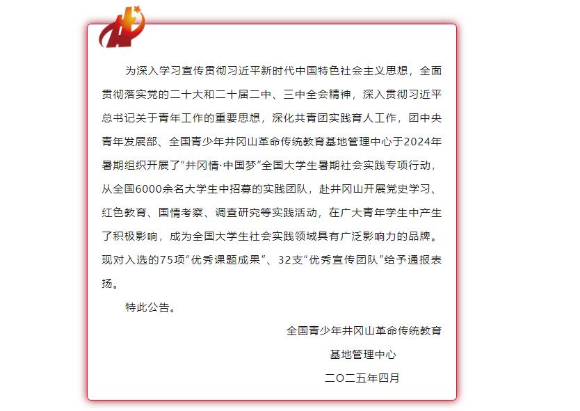 据悉,2024年“井冈情·中国梦”全国大学生暑期社会实践专项行动是由团中央青年发展部指导,全国青少年井冈山革命传统教育基地管理中心主办的社会实践活动。350vip8888新葡的京集团“星火传承”调研团成功入选为第三期实践团队,是我校师生首次参加该活动。新时代,青年一代要深入理解,弘扬井冈山革命传统,赓续红色血脉,以青春为中国式现代化挺膺担当。