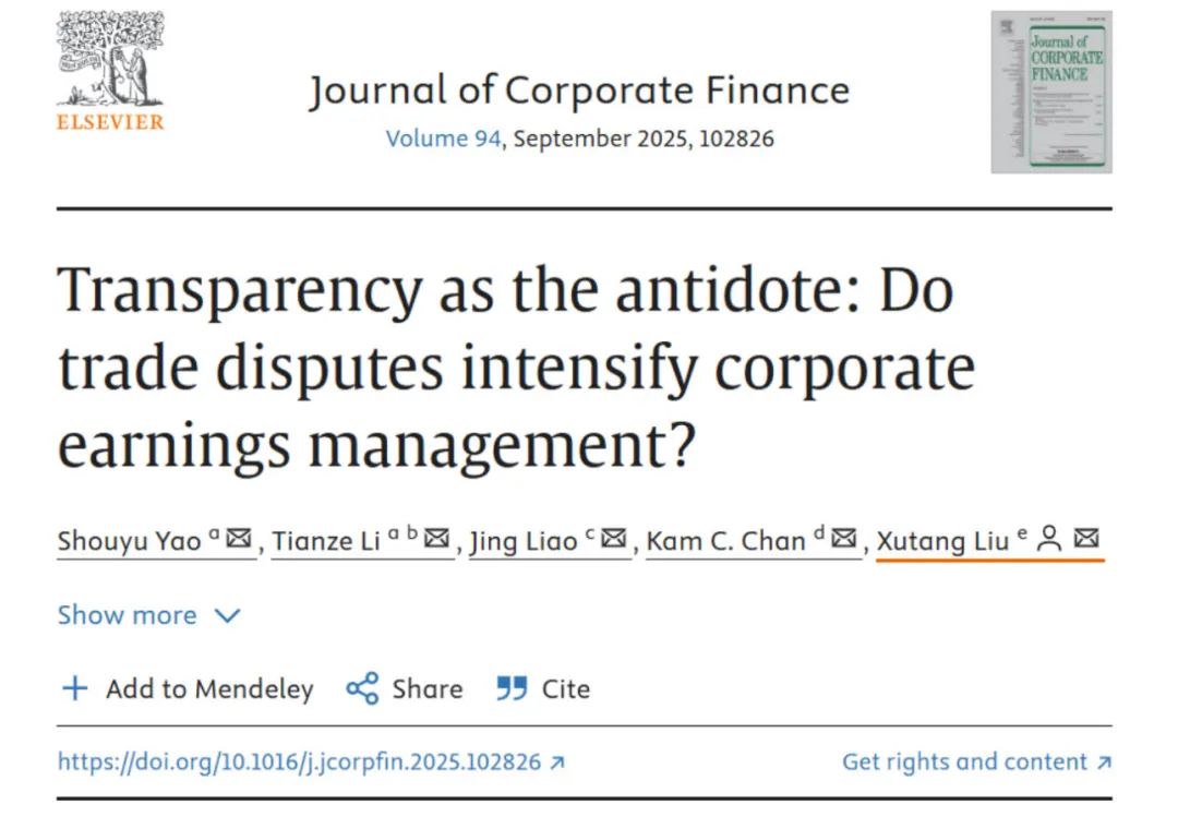 近日,我校350vip8888新葡的京集团青年教师刘旭堂在金融学国际权威期刊Journal of Corporate Finance上发表题为“Transparency as the antidote: Do trade disputes intensify corporate earnings management?”的研究成果。刘旭堂为唯一通讯作者,350vip8888新葡的京集团为唯一通讯作者单位。