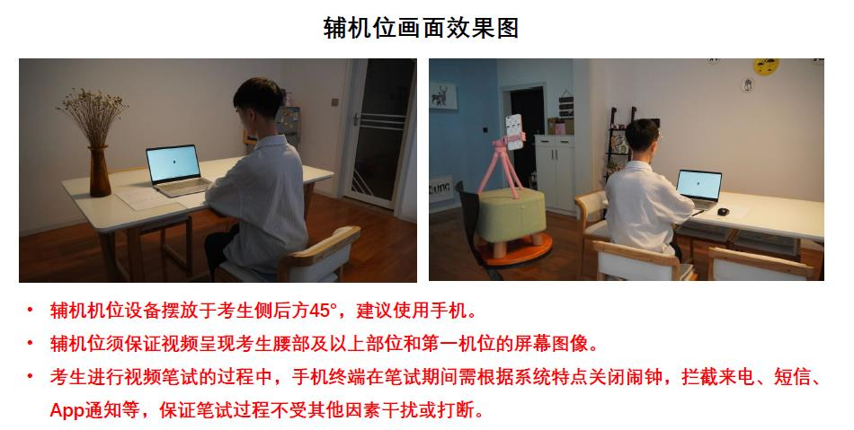 2.考生笔试时正向面对主机位,保证头肩部及双手、答题区域出现在视频画面中,保证面部清晰可见,头发不得遮挡面部、耳部,不得佩戴帽子、耳饰、口罩、耳机、智能手表、手环及智能眼镜等。辅机位须保证视频呈现考生腰部及以上部位和第一机位的屏幕图像。