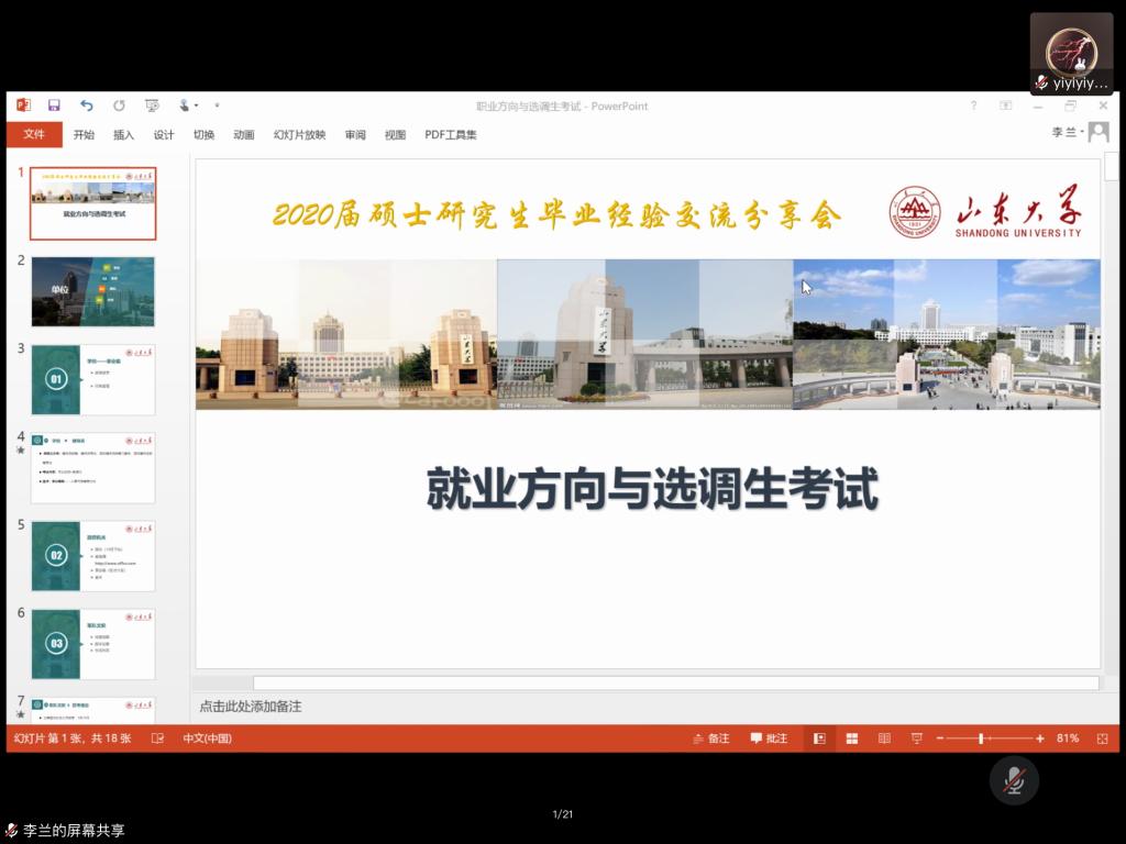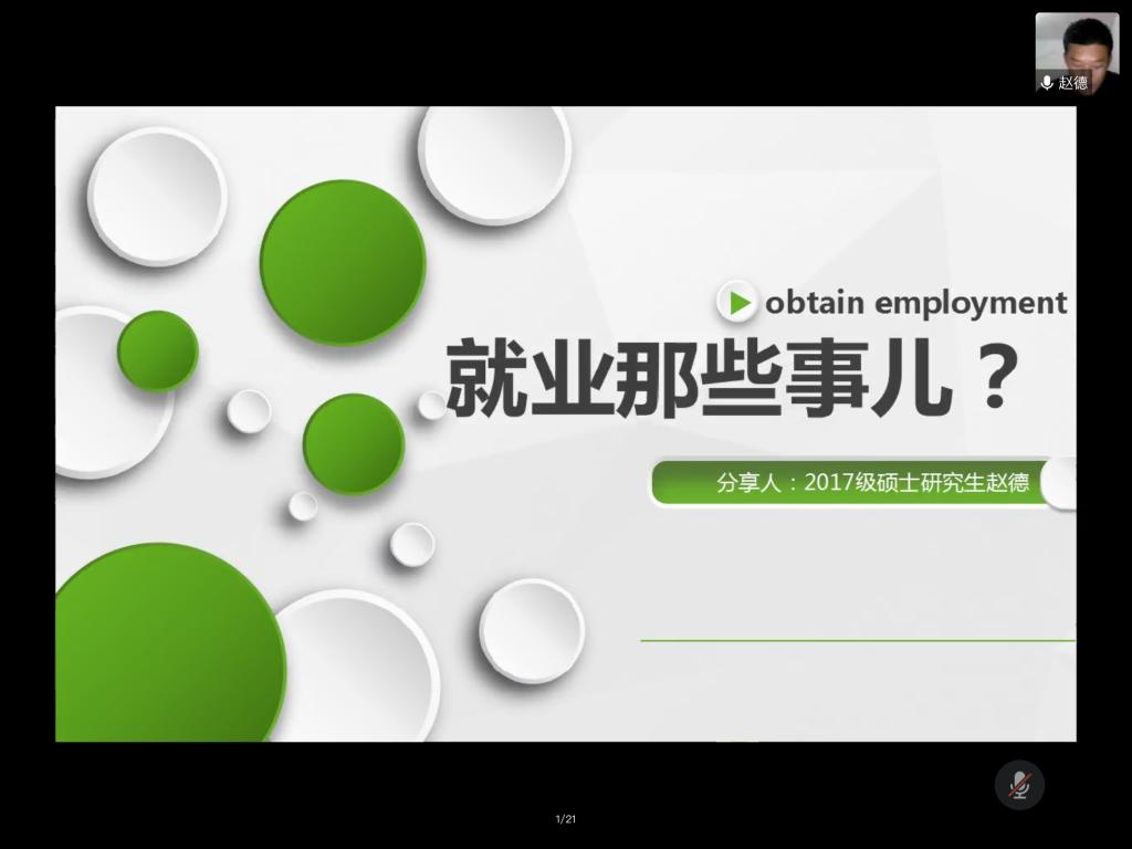 本次活动共邀请了11位2020届硕士毕业生进行经验分享。其中李兰与孔祥久以“职业方向与选调生考试”为题分享了她们考公务员的经历。在职业方向方面,李兰从学校、政府、军队、企业四个职业方向介绍了待遇保障、考招信息获取、考试科目,在选调生考试方面,孔祥久从招考信息、选调待遇、考试内容、备考心得四个方面展开分享。除此之外,她们还提供了相关的微信公众号以及网站帮助同学们获取更多的信息以及更好地备考。王文竹、王成文、薛晓雯分别分享了研究生三年的学习、生活、工作,并建议同学们在研究生期间不仅要做好科研工作,而且要兼顾其他方面,做事要有目标、要坚持赵德分享了求职的六点诀窍,即找定位、定目标、列计划、寻方法、敢尝试、平心态。展茂浩分享了四点科研经验:坚持、研究专一、仿写、谨慎对待审稿意见,要积极参与各类学术活动,不要感觉跟自己研究方向关系不大就不参加,每一次听讲都是自己知识积累的“填充”。在互动环节,低年级同学踊跃发言,就如何备考高校辅导员、选调生等职业的笔试、面试问题进行提问,毕业生们对所提问题一一作了解答,现场气氛热烈,同学们得到了充分的交流与沟通。