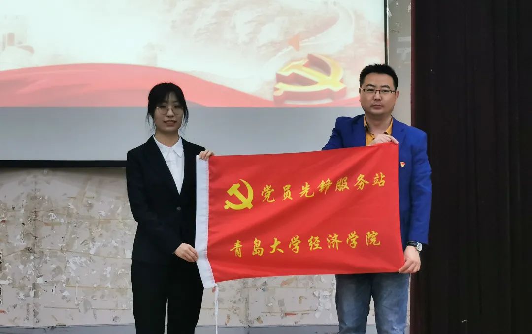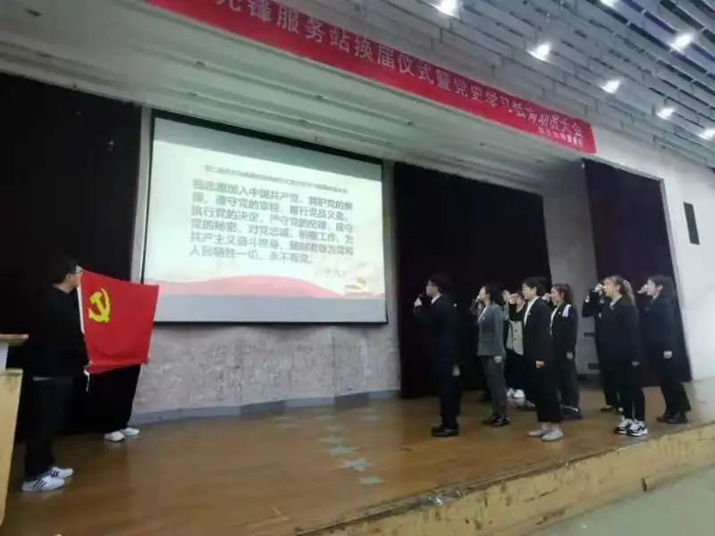 第三学生党支部书记任龙和上任党员先锋站指导老师李冉分别为新任党员先锋站指导老师卢嘉琦及服务站成员授旗并授予聘书。卢嘉琦老师就党员先锋服务站工作发表讲话,呼吁同学积极做好党建工作。随后全体党员重温了入党誓词。此后,进行党史学习教育动员大会,全体观看党史视频,共同回顾百年党史,认真学习党史教育。最后,任龙老师就党史学习教育发表讲话。