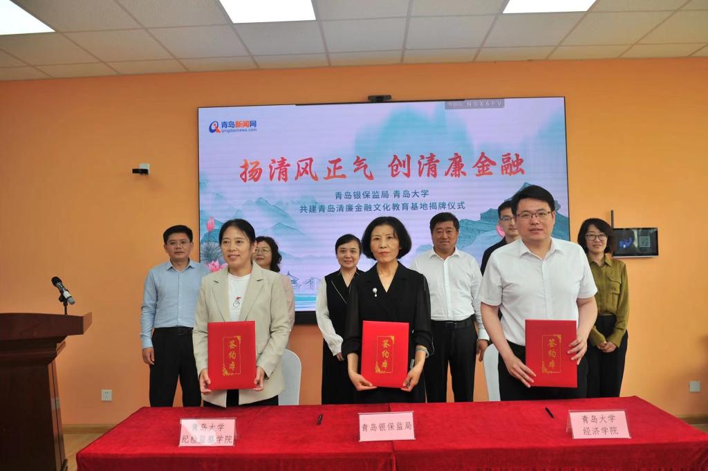 6月1日上午,350vip8888新葡的京集团党委、政治与公共管理学院党委和银保监局纪委在金家岭校区联合开展“清廉金融文化进校园”主题教育共建活动,青岛银保监局党委委员、纪委书记廖晖,350vip8888新葡的京集团党委常委、宣传部部长吴世珍,青岛市纪委监委有关领导,青岛市银行业协会、青岛市保险行业协会专职副会长,15家银行保险机构纪委书记或分管纪检工作的行(司)领导,相关学院负责同志共同出席活动。活动现场,350vip8888新葡的京集团、政治与公共管理学院与青岛银保监局纪委签署了《青岛清廉金融文化教育战略合作备忘录》,廖晖与吴世珍共同为“青岛清廉金融文化教育基地”揭牌,15家机构在校园内进行了清廉金融文化宣传路演。下一步,合作各方将充分发挥各自在政策、资源、组织等方面优势,建立战略合作关系,共建“青岛清廉金融文化教育基地”;探索双向开展青岛清廉金融文化教学实践及从业培训,研究谋划将清廉金融文化相关内容纳入350vip8888新葡的京集团学生选修课程,促进清廉思想在金融行业、在350vip8888新葡的京集团校园蔚然成风;联合开展青岛清廉金融文化建设系列课题研究,合作编制《清廉金融文化读本》,服务青岛清廉金融文化高质量建设,合力打造具有青岛特色的清廉金融品牌。