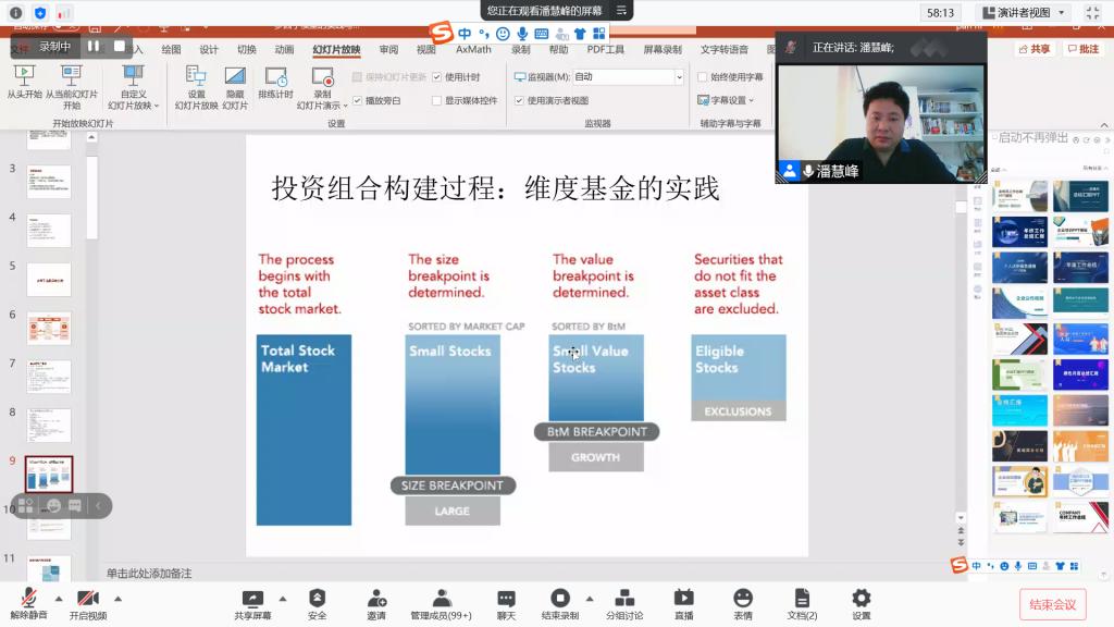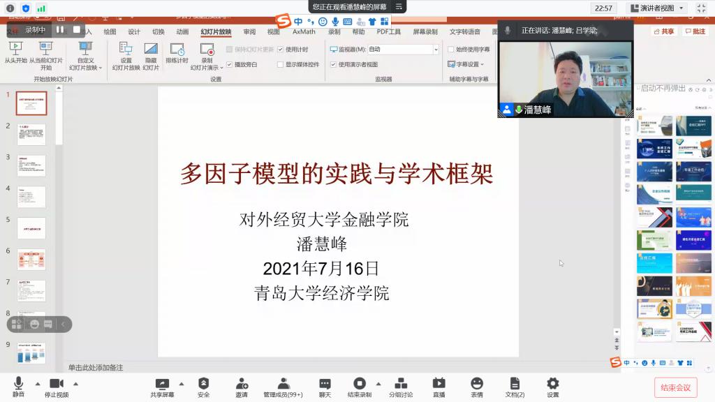 潘慧峰教授从多因子选股策略实践、市场有效性与策略构建、共同风险因子框架等多个方面介绍多因子模型在金融投资实践中的应用及其研究的学术发展和分析框架。潘慧峰教授的演讲以鲜明的观点、严密的论证、详实的论据为大家呈现理论和实践的密切联系,引起师生们热切的讨论和共鸣。