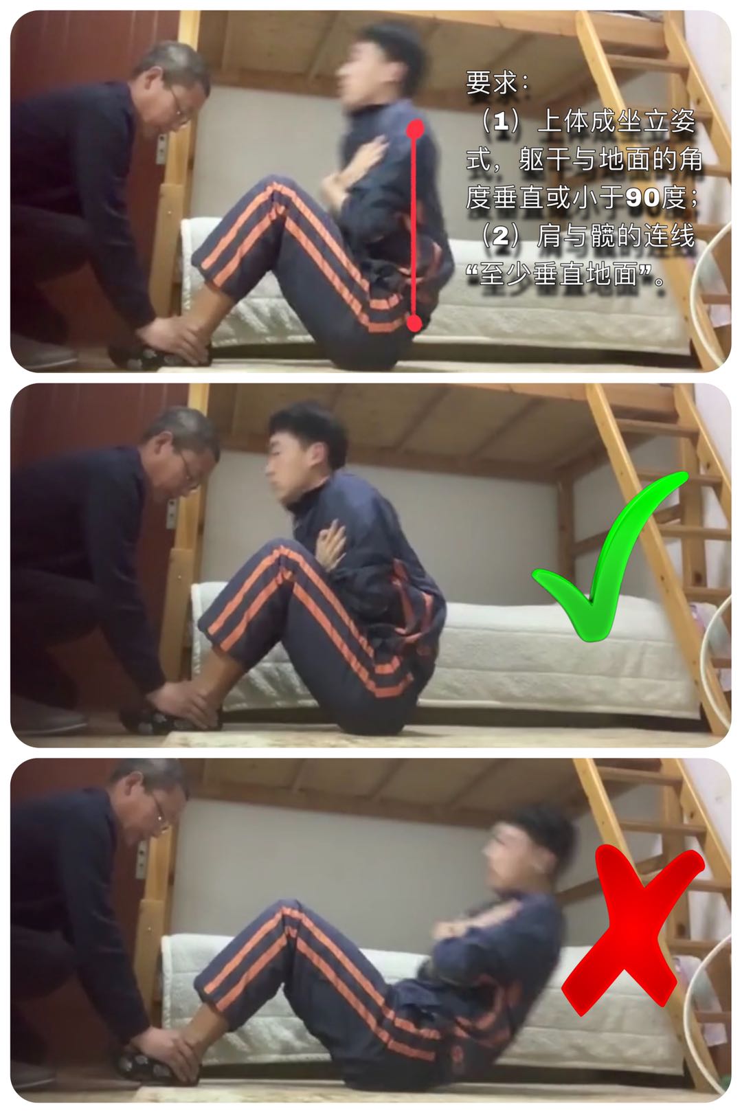 2.上体坐起:以腹部主动发力带动上体坐起。要求:上体成坐立姿势,躯干与地面的角度垂直或小于90度(肩与髋的连线“至少垂直地面”),双脚要始终与地面相接触。(比赛全程期间禁止双手抱头,以免在比赛时因用力过度而拉伤颈部肌肉)。如图2
