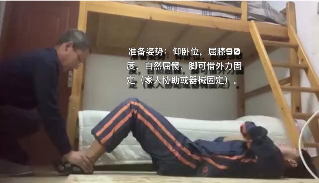 1.准备姿势:参赛者屈膝,仰卧于垫上。要求:肩胛骨触及垫子,双手交叉环抱于胸前,双腿稍分开,屈膝90度,双脚可借外力固定(家人协助或器械固定),拍摄工具位置要与参赛者保持水平角度。如图1