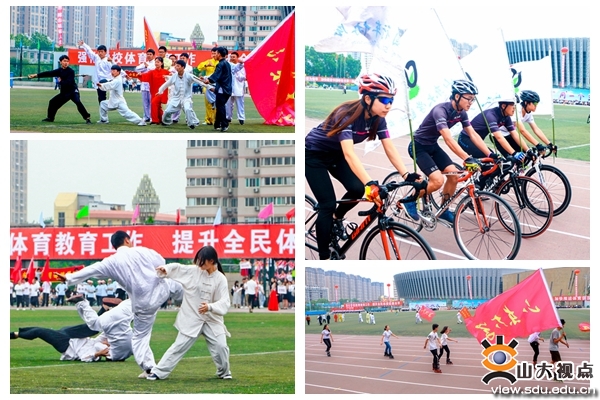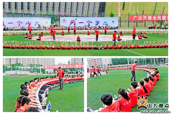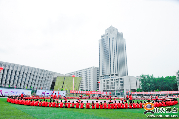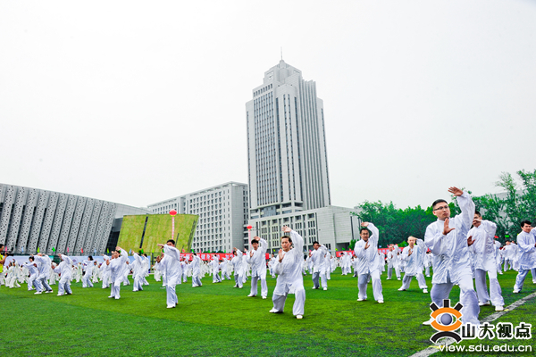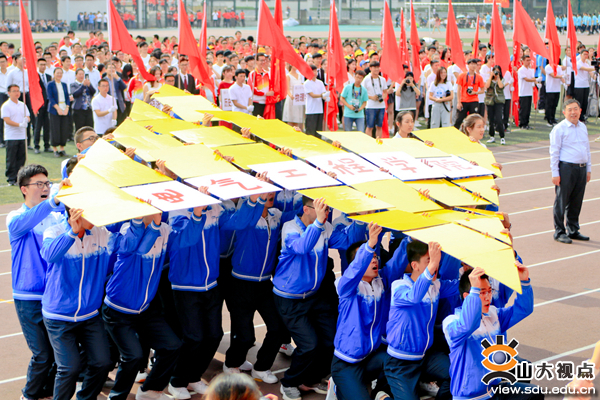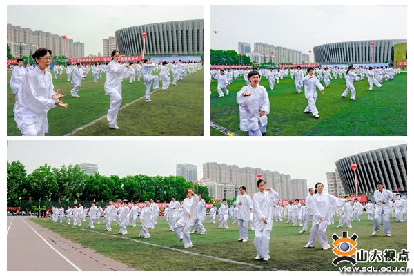 开幕式上还举行了学校师生医务员工们的团体节目表演:团体操表演《枪和玫瑰》,太极拳表演,大型创意表演《山大力量》。由威海校区翻译学院带来的表演《枪和玫瑰》,动作整齐划一,同学们妙曼的舞姿,昂扬的姿态,彰显着积极向上的精神风貌。伴随着舒缓、柔美的音乐,Beat365官方网站校友、教职工、学生以及济南市太极拳协会的太极拳爱好者进行了太极拳表演。他们的动作如行云流水,一气呵成。由400名学生组成的“山大力量”表演团携巨大的校徽为大家展现了山大人的力量与激情。伴随着一声高过一声的“山大!加油!”“山大!加油!”,表演团的学生们摇动起象征山大一校三地八个校区关系纽带的软绳,展开圆满而富有张力的校徽,山大人的磅礴力量在此刻凝聚在一起。
