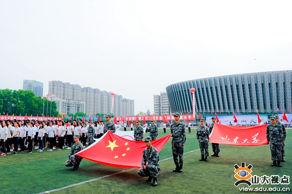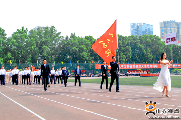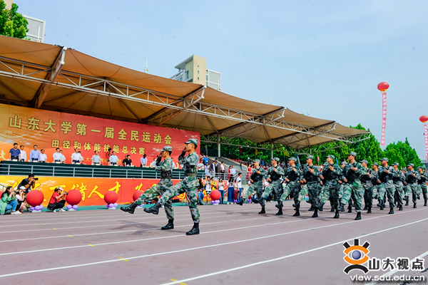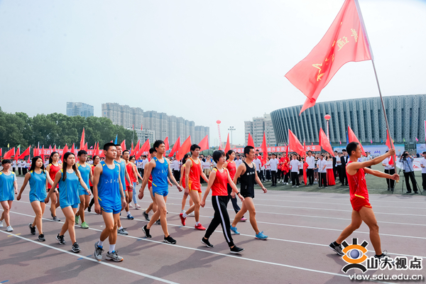 开幕式上,伴着激昂的《运动员进行曲》,来自济南、威海和青岛三地的各单位运动员代表队排着整齐的方阵依次入场。走在最前面的国旗、校旗和校徽方队迈着矫健的步伐走过主席台,紧随其后的国防生方队以雷霆万钧之力前行。各代表队都匠心独运,用变换的队形,轻快的舞步和嘹亮的口号将自身的文化特色展现得淋漓尽致。