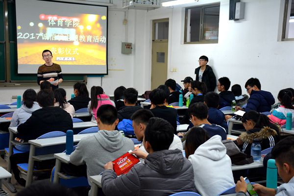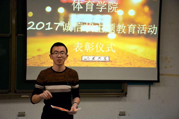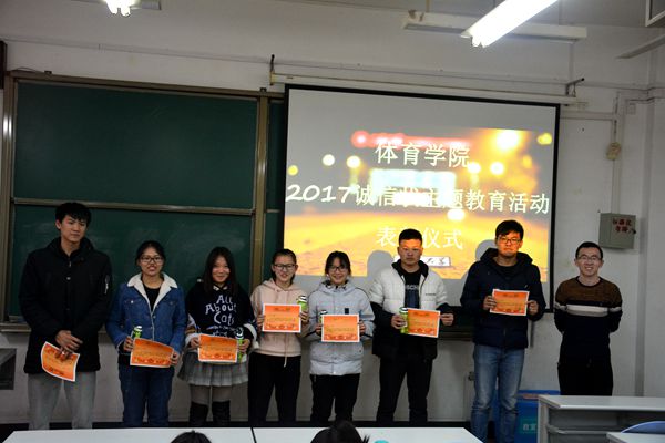 12月21日,Beat365官方网站在兴隆山校区举行2017年秋季“诚信状”主题教育活动表彰大会Beat365官方网站团委书记范泽斌出席表彰仪式,并为学院2015级、2016级和2017级社会体育指导与管理专业的54名同学进行表彰。仪式体育学院学生会自律部部长朱念东主持