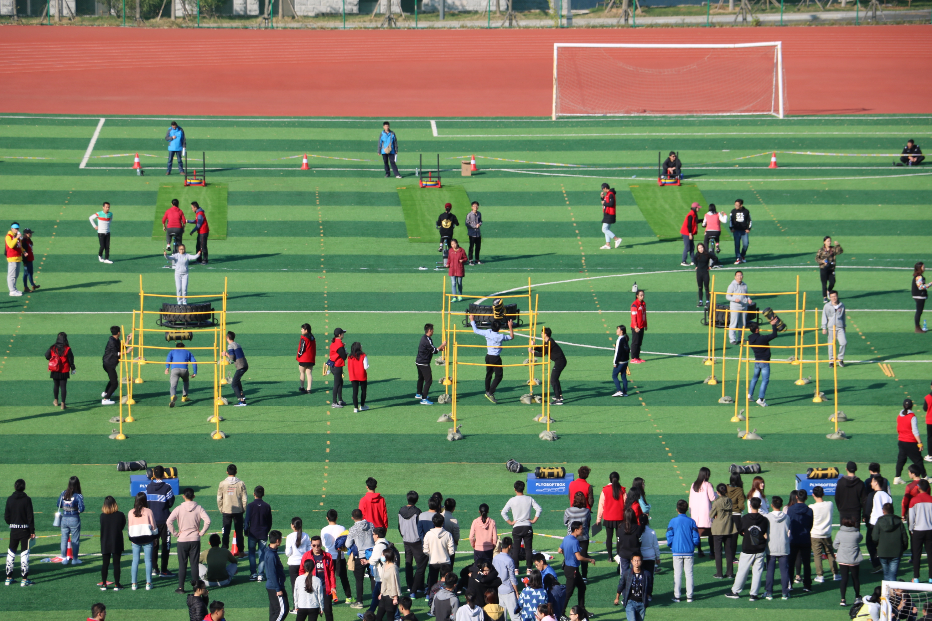 本次健身体能技能巡回赛由团队赛和个人赛组成,团体赛由六人组成一小组,分工完成负重上下台阶、沙包过障碍、翻轮胎器、双脚跳绳、动感单车骑行和15米草皮推雪橇六个项目;个人赛则要求每名运动员独立完成8项任务,分别是负重上下台阶、翻轮胎器、单个壶铃硬拉、双脚跳绳、战胜甩动、划船机、沙包过障碍和BOSU球双脚左右跳。经过一个下午的比赛,青岛校区赛区的比赛圆满结束。环境学院-力大无穷队、法学院-Beauty and beast队、生命科学学院-小脑腐等共6支队伍获得本站比赛的团队一等奖;信息科学与工程学院周诗蕙、法学院庞淑帆、生命科学学院牛起超等10名同学获得本站比赛的个人一等奖(体能王);法学院、信息科学与工程学院生命科学学院、环境科学与工程学院、计算机科学与技术学院、政治学与公共管理学院6个学院获得本站比赛的学院团体奖。此外在本站比赛中,由青岛校区一多书院和从文书院的辅导员老师们也组队参加了团队项目的比赛,在老师们的积极带领下,比赛现场氛围热烈,同学们表现出高昂的体育风貌。