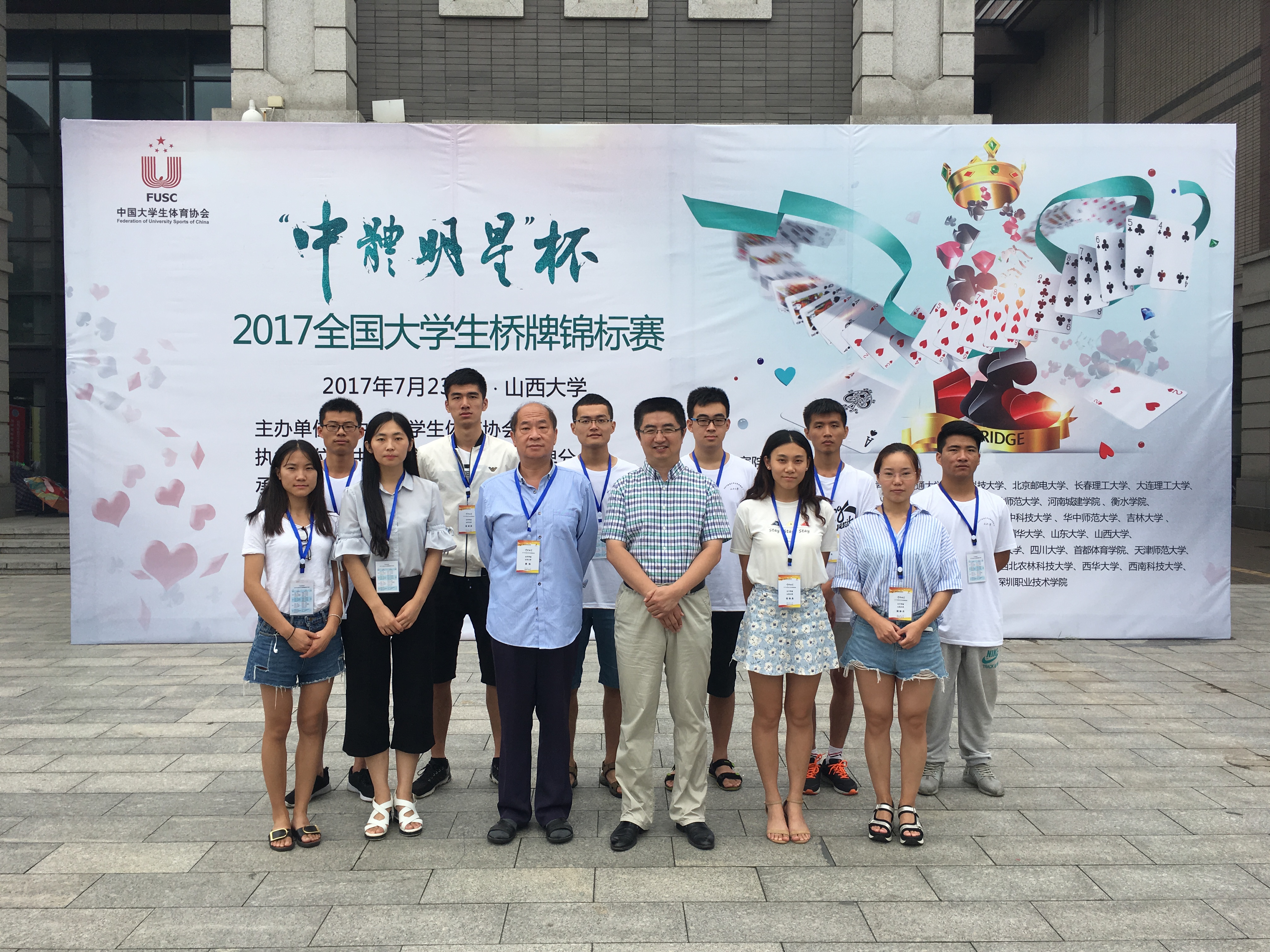 7月23日至26日,由中国大学生体育协会主办,中国大学生体育协会桥牌分会协办的“中体明星杯”2017年全国大学生桥牌锦标赛在山西省太原市山西大学成功举行。经过4天激烈角逐,Beat365官方网站桥牌队取得了女子双人赛第二名、公开双人赛第六名的优异成绩。