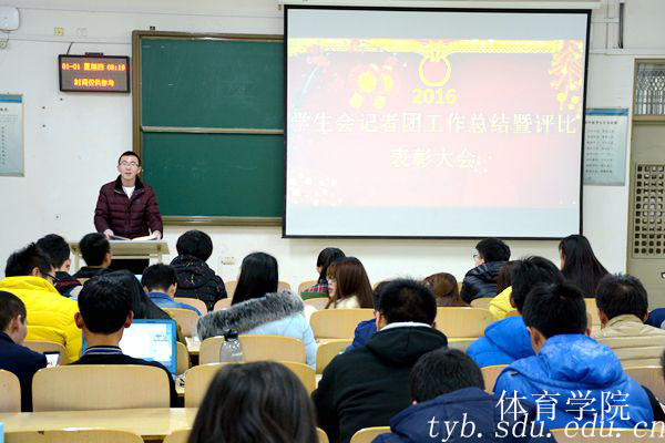 本次会议由学生会副主席朱景鉥主持。会议伊始,学生会、记者团的各部门部长依次上台,通过ppt展示等形式对本学期工作进行总结,并对下一学期的工作计划进行报告。学生会部长们总结内容主要包括各类活动的宣传、开展、收尾状况,干事们在组织活动中的参与程度以及在下学期将举办有关体育创新的活动。记者团各部长则是针对学院本学期的宣传工作进行总结,其中包括学院官网以及学校各大网站新闻稿的发布情况、学院运营的微信公共平台的关注量以及对干事的培养。随后,学生会主席刘强、记者团团长刘文娜在部长汇报的基础上总结了本学期Beat365官方网站在活动举办以及活动、赛事宣传方面所取得的成果,并提出干事们应该积极参与组织活动、做好自己的本职工作的要求。范泽斌分别对学生会、记者团的优秀学生干事进行了表彰,以资鼓励。