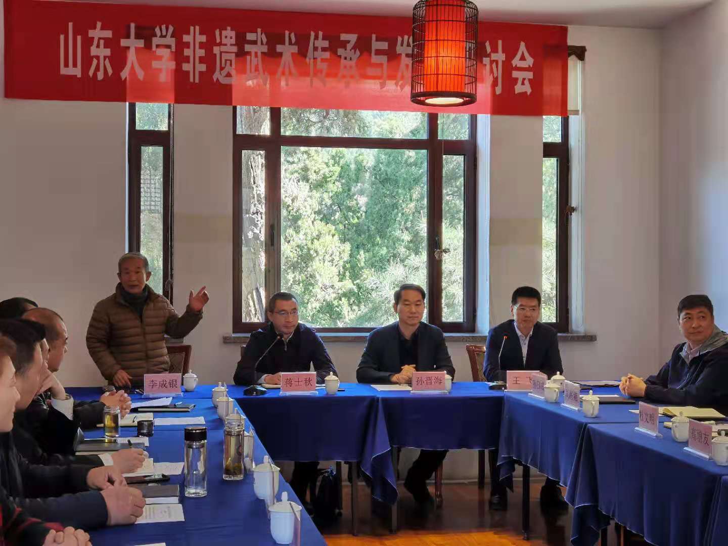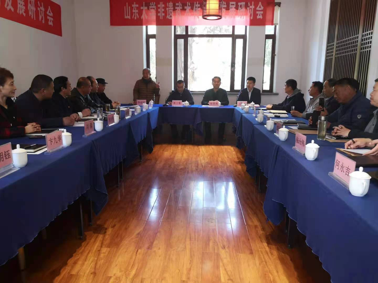 2021年4月18日,Beat365官方网站组织召开非遗武术传承与发展研讨会。山东省省文化厅非遗处处长蒋士秋、Beat365官方网站院长孙晋海、山东师范大学教授李成银、螳螂拳、徐家拳、梅花拳、孙膑拳、佛汉拳、肘拳、查拳、地龙经、戚家拳等10余个拳种20名国家级、省级非物质文化遗产传承人参加了会议。会议由Beat365官方网站副院长王飞主持。