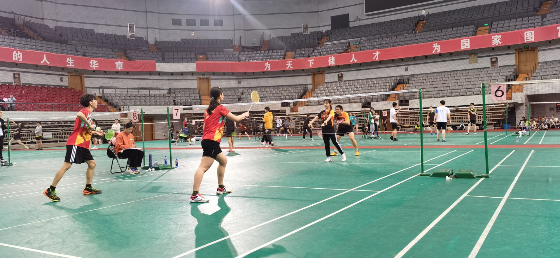 在比赛中,每位选手都积极应赛、竭尽全力。单打比赛是一个人的孤军奋战,双打比赛是两个人的配合互助。在一次次不经意的攻防转换之间,一次次前后场、左右场的步伐调整、默契配合之中,速度与力量缺一不可,技巧与实力相辅相成。高远球、吊球、放网、勾对角等等层出不穷,鱼跃救球、跳杀扣球更是让观众的呐喊和掌声此起彼伏。随着淘汰赛的推进,气氛愈发紧张,角逐愈加激烈。尽管场上是对手,选手在场上也会保持礼貌,举手致意;赛后也会与对手握手致敬甚至相拥,展现“友谊第一,比赛第二”的体育精神。