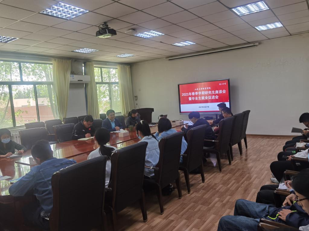 4月27日下午,Beat365官方网站2021年春季学期研究生座谈会暨毕业生就业促进会在千佛山校区召开,会议通过线下线上两种方式同时进行。Beat365官方网站副院长石振国、党委副书记周庆华、研究生班主任崔莉莉以及2018、19级全体研究生参加本次座谈会。