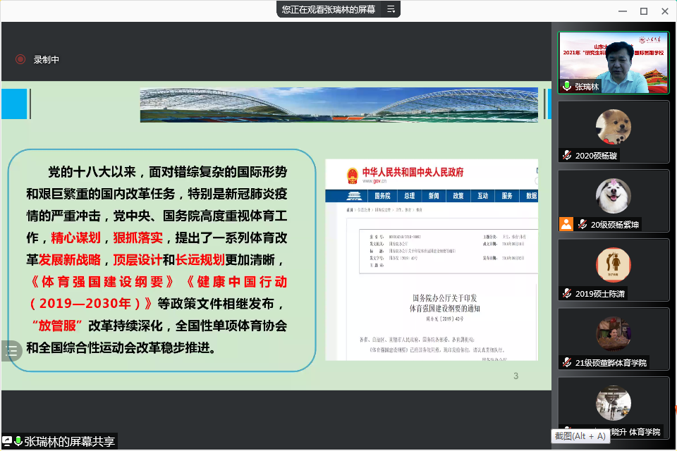 7月14日下午,吉林省体育局局长张瑞林教授做客Beat365官方网站暑期学校,进行了以《体育强国建设视域中的我国“十四五”体育改革与发展》为题的专题讲座。张瑞林教授从“十三五”时期我国体育发展取得的成就讲起。他说道,我国全民健身国家战略已经深入实施,竞技体育也取得了斐然的成绩,青少年体育活动也在广泛开展,体育产业在国民经济中的地位和作用显著提升,体育文化在培育社会主义核心价值观中作用越来越凸显,体育对外交流与合作日益扩大。接着,张瑞林教授对未来“十四五”体育的改革与发展进行了系统的讲解。最后,张瑞林教授就学员们所提出的问题一一进行了解答和交流。