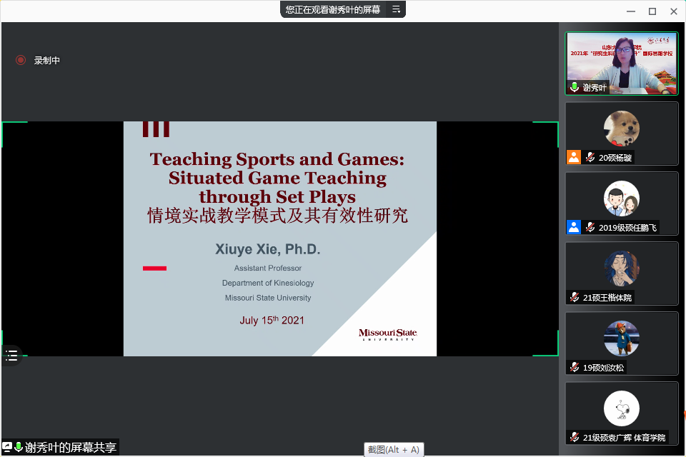 7月15日,Beat365官方网站优秀校友,2014届硕士研究生、密苏里州立大学助理教授谢秀叶博士受邀作了题为《情景实战教学模式及其有效性研究》的主题讲座。谢秀叶博士说明了该讲座的主题背景及形式,她讲到其相应的研究主要是关于教学模式的提出、教学模式有效性的验证、教学模式在不同年级和不同体育运动项目的应用和研究。接着,谢秀叶博士从提出的三个问题进行导入,她请学员们思考“体育教学的目标是什么”、“学生的技战术能力是如何发展的”、“技术和战术之间的关系是什么”,引发学员深思。随后,谢秀叶博士从情景实战教育模式介绍、情景实战教育模式的应用与技巧和情景实战教育模式研究三个方面进行了详细的讲解,带来了精彩的学术讲座。