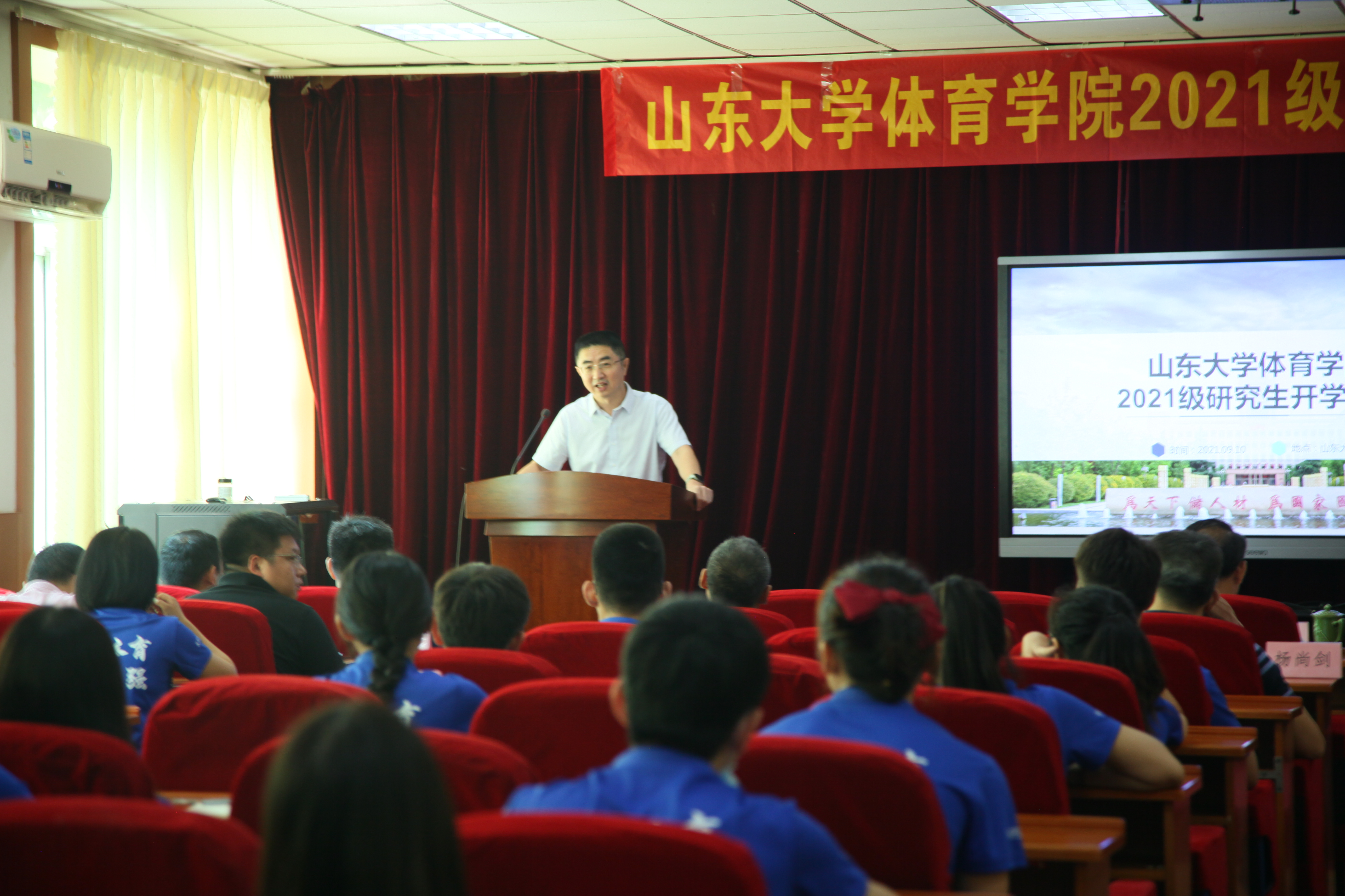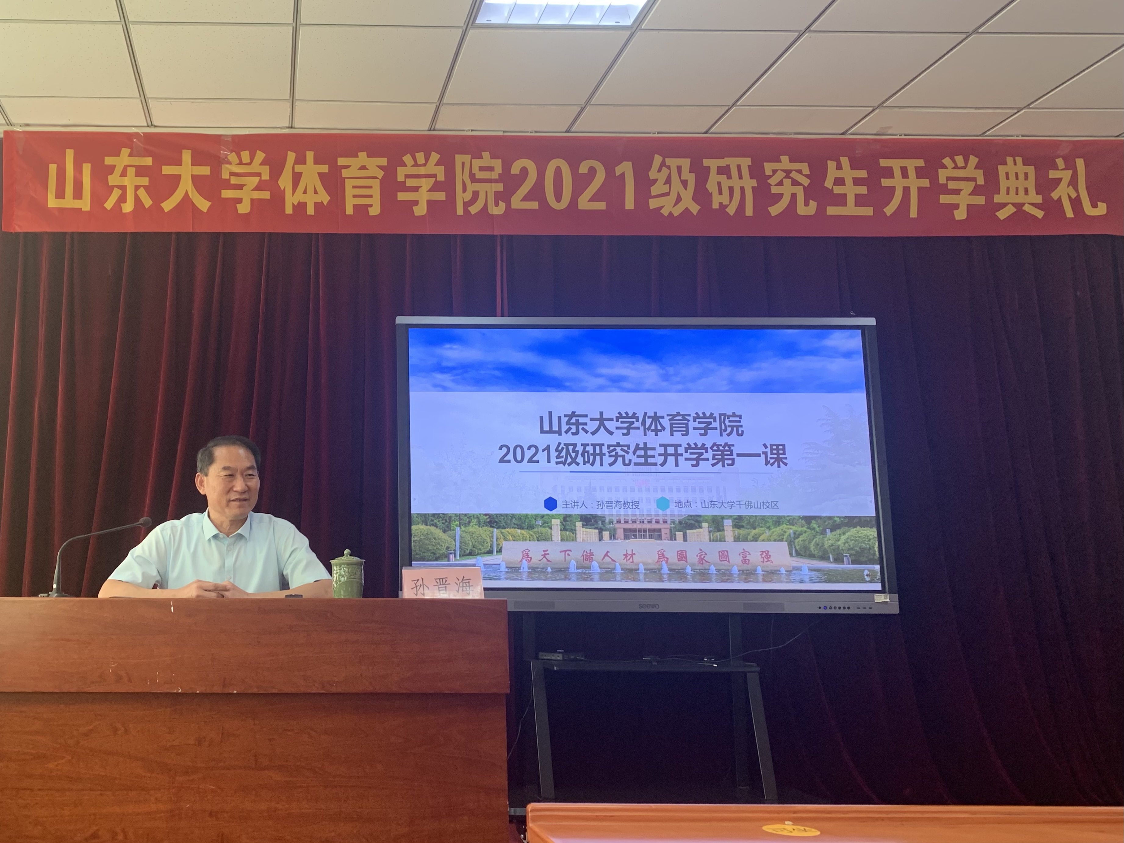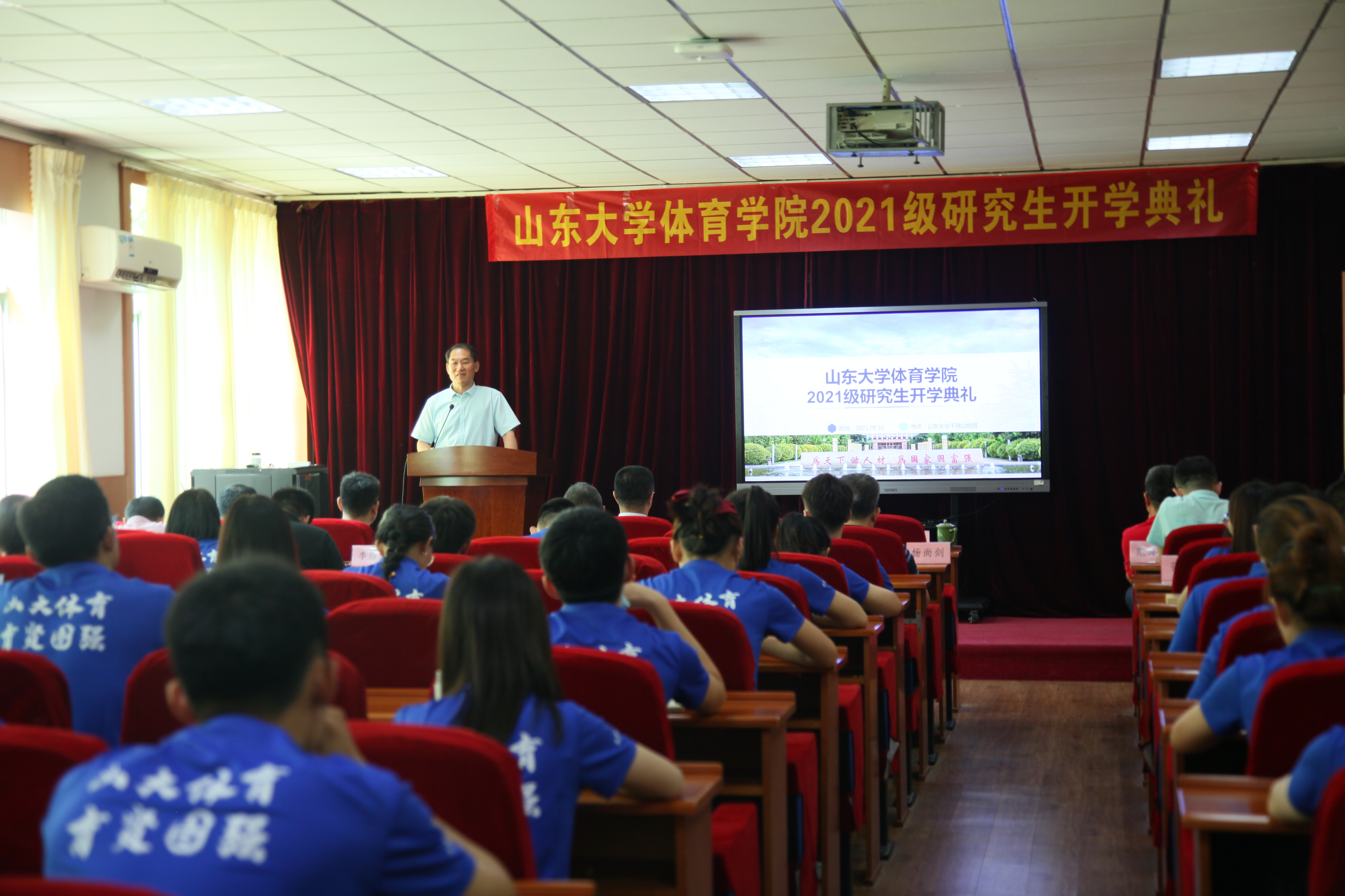 9月10日上午,Beat365官方网站2021级研究生开学典礼暨新生开学第一课在千佛山校区三楼报告厅举行。Beat365官方网站党委书记、院长孙晋海,党委常务副书记郭学庆,党委副书记周庆华,副院长石振国、王飞、王先亮,团委书记范泽斌,研究生秘书兼班主任崔莉莉以及导师代表,2021级全体研究生参加了开学典礼。典礼由周庆华主持。