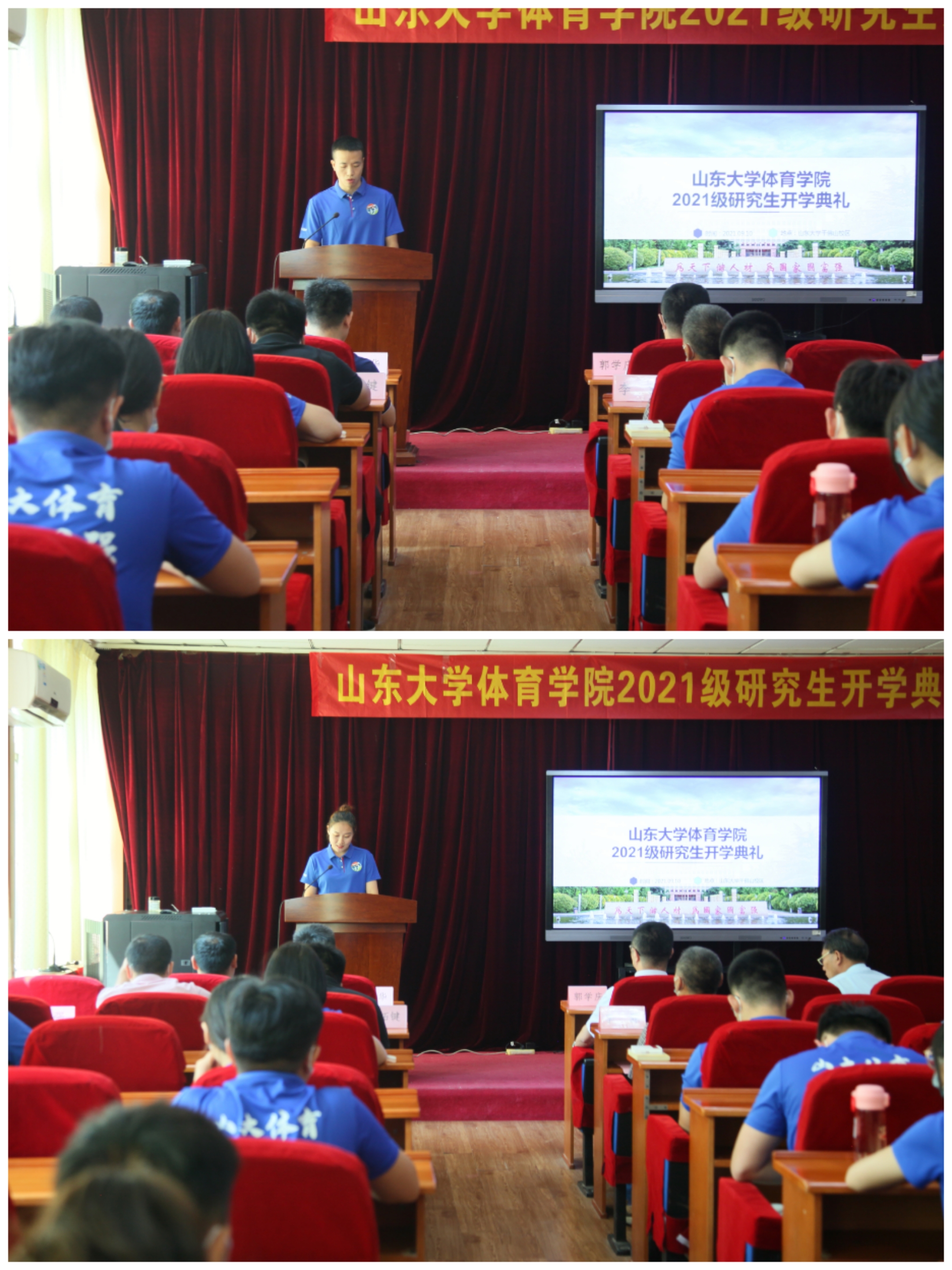 典礼上,郭学庆给全体新生开展了校史院情教育活动,介绍了学校和学院自成立以来发展的各阶段成果。石振国介绍了Beat365官网研究生的教育培养管理的各个方面,同时要求所有学生要养成“好读书、读好书、读好书”的良好习惯,进一步阐述了“为什么读书、读什么样的书,怎样读书”的初衷试命,他同时积极鼓励大家积极参与学院“T语堂”系列活动,积极参加学术讲座和学术沙龙,在导师指导下,不辱使命、不虚此行。周庆华就研究生思政教育及日常事务管理做了简单介绍,他希望同学们在研究生阶段积极与导师沟通,加强安全意识和自我教育、自我调节的能力。博士研究生巫前锦和硕士研究生刘惠淼分别代表2021级博士新生和2021级硕士新生发言。他们都表达了进入Beat365官方网站的荣幸和激动,希望未来以老师、师哥师姐们为榜样,努力奋斗、团结友爱,秉承校训精神,学无止境,气有浩然。王先亮老师作为导师代表在典礼上发言,他提到,近些年Beat365官方网站在师生共同努力下,发展迅速,成果斐然。同时,从导师的角度,提出了“三项目标、三条路径、三大举措”,激励同学们在学术道路上,顽强拼搏、锐意进取、积极创新,做一个优秀的体育人,为体育学科发展贡献自己的青春。