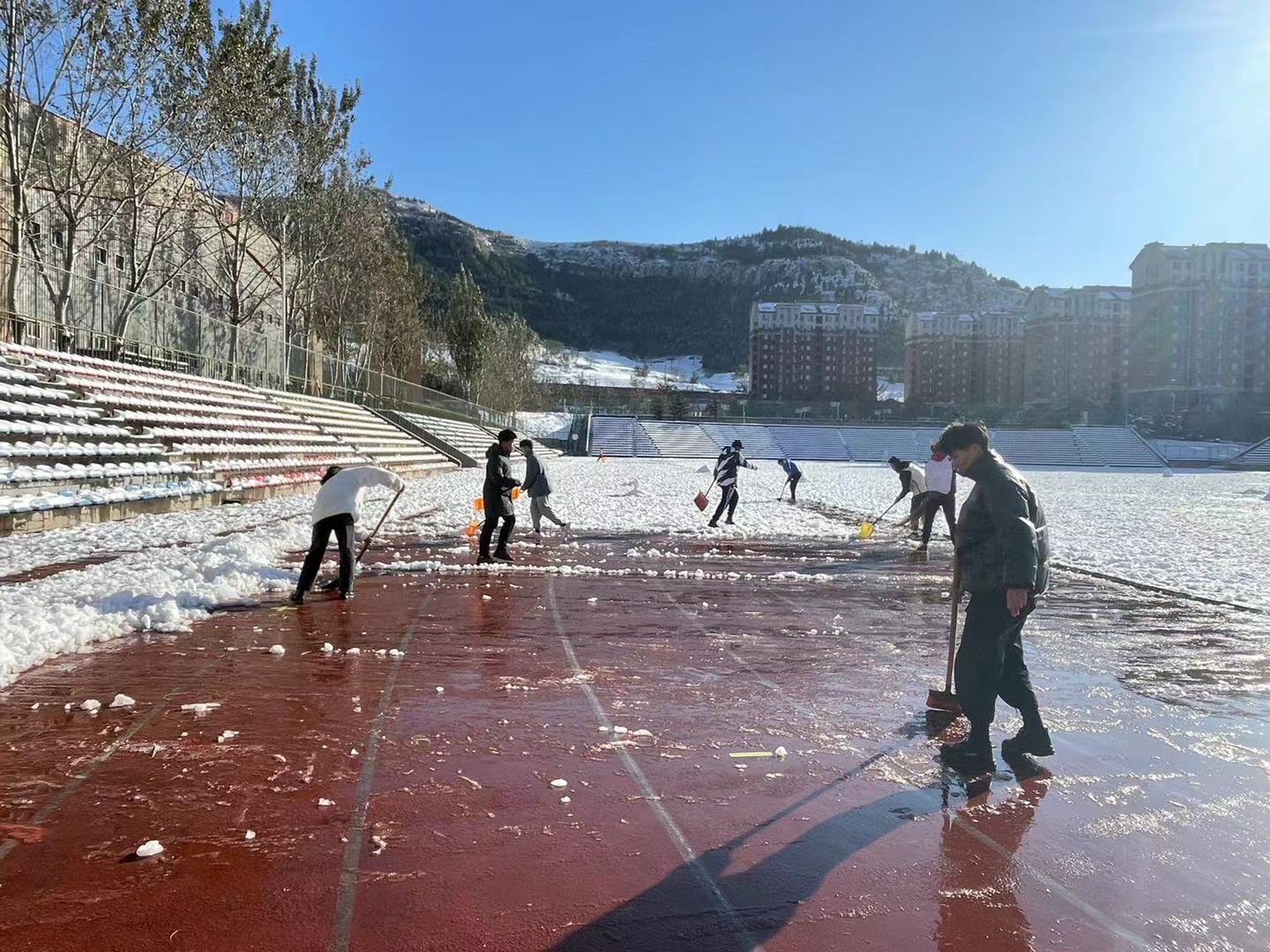 此外,体测活动因跑道积雪而耽搁推迟,为不耽误校区学生体测、体育课程、体育活动的正常进行,8日下午,本科生党支部、各团支部于兴隆山风雨操场再次进行铲雪工作。在全体同学们的努力下,风雨操场的跑道终于从一开始的白雪皑皑变成了最后的通畅无阻。