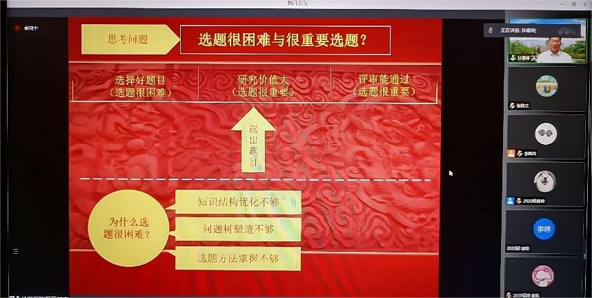 开班仪式后,Beat365官方网站院长孙晋海教授为暑期学校学员作了题为《体育科研问题选题方法论》的学术讲座。首先,孙晋海抛出问题“选题很重要,但为什么选题很困难?”,孙晋海指出,选择好的题目很困难,但一个好的题目研究价值大、评审易通过。之所以感到选题很困难,主要原因是知识结构优化不够、问题树塑造不够、选题方法掌握不够。接着,孙晋海从选题举例、选题三要、选题解读、到哪儿选、怎样选题、题目推敲六个方面进行详细讲解,分享了选题的思路、方法与技巧。过程中,他结合大量关于小论文的写作、大论文的选题以及国家级项目申请选题的案例,讲解了“问题树”即既要有理论的基础,又要有选题的方法论的结构,同时告诉大家,在选题过程中要做到三要:要创新、要有价值、要能完成。最后,孙晋海强调,“选定题目以后要反复推敲”,不仅要把题目拓宽、拓深,而且还要拓展,还要及时和周边的同学、老师以及学者进行交流,把选题从“精、深、广”的角度进行推敲。