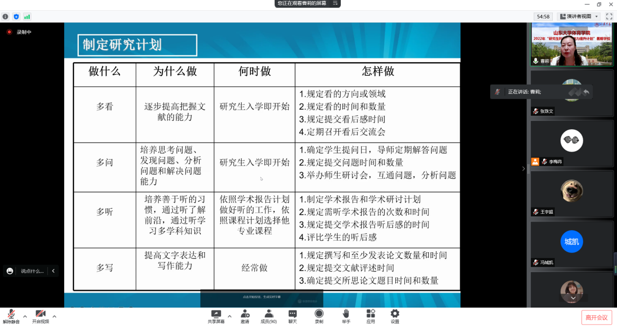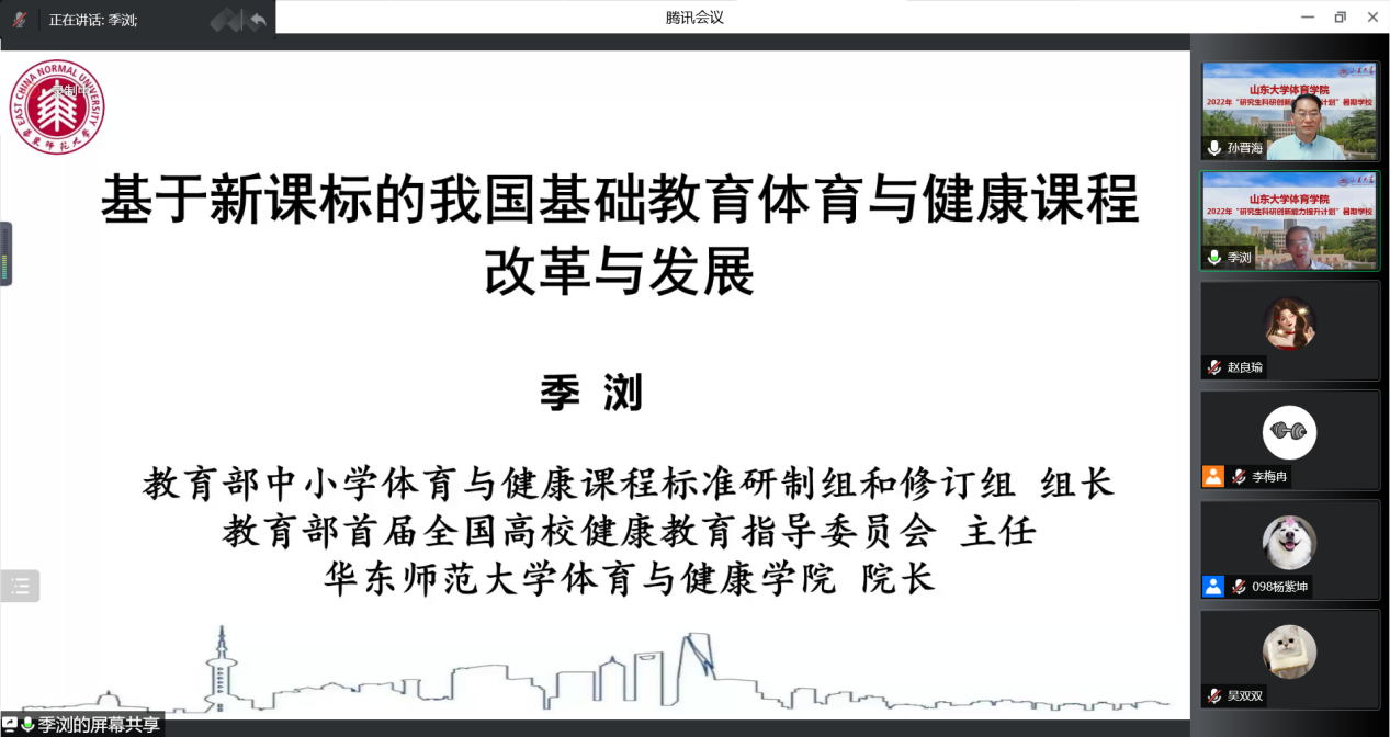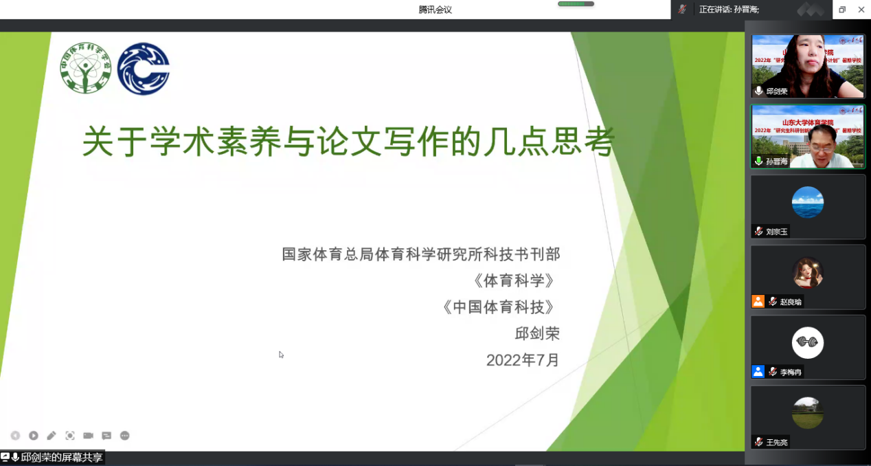 2022年7月4日至7月16日,Beat365官方网站“研究生科研创新能力提升计划”暑期学校成功举办。本次暑期学校通过线上形式举办,以学术讲座的形式,围绕体育科研问题选题、科研论文写作、学术道德规范、体育学领域学术前沿等专题举办了11场讲座,为学员们讲授了本学科领域的学术发展动态和最新研究成果,分享了科研方法和论文写作的相关经验,旨在进一步提升我校体育学研究生的科研能力,不断拓宽学术视野。