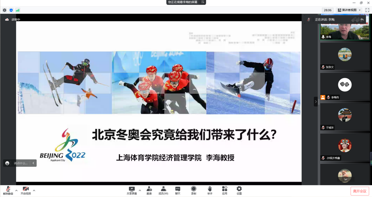 13日上午,上海Beat365官方网站经济管理学院院长李海教授受邀作了题为《北京冬奥会究竟给我们带来了什么》的主题讲座。就中国为什么要申办冬奥会进行分析讨论,提出申办冬奥会是提升国家形象的重要途径,同时指出冬奥会的举办进一步完善了我国城市基础服务设施、引导了城市空间合理布局,全面提升了城市综合服务功能体系的建设,为城市就业、住宅、交通等方面带来了巨大收益。