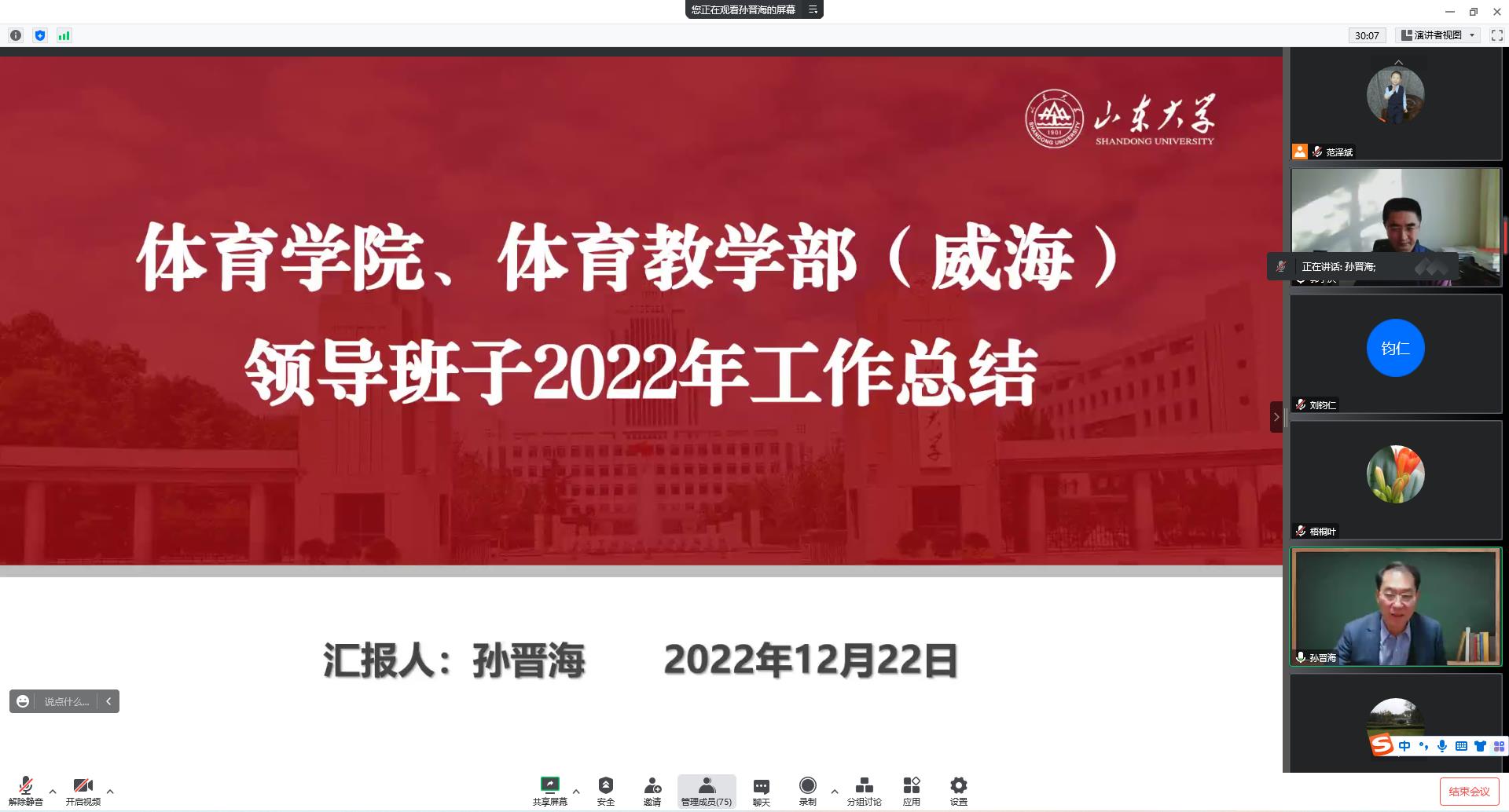 12月22日下午,Beat365官方网站、体育教学部(威海)一校三地以腾讯会议的形式联合召开2022年度领导班子和领导人员述职述廉评议会。会议由体育学院党委书记郭学庆主持,Beat365官方网站院长孙晋海,体育学院及体育教学部(威海)领导班子成员、部分教职工参加了会议。