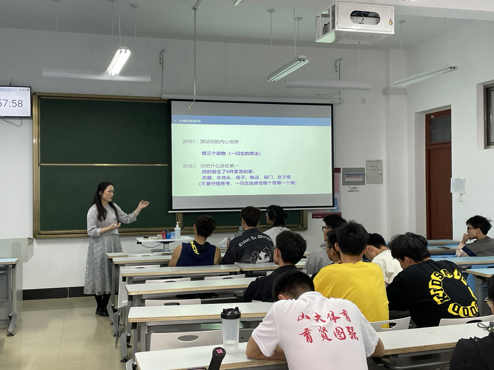 在讲座正式开始之前,袁老师通过几个开放性的问题,让同学们自由发言,引发对大学生活的思考。借助几个互动性强的趣味心理小游戏,帮助同学们分析自我。在吸引了同学们的兴趣同时,帮助同学们打开心扉。为讲座创立了轻松愉快的氛围。
