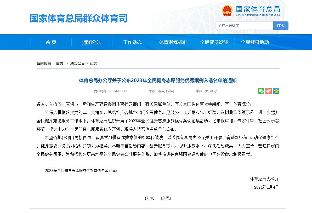 近日,为进一步提升全民健身志愿服务工作水平,选树典型引领示范,引导更多志愿服务组织和志愿者积极参与全民健身志愿服务活动,国家体育总局公布了“2023年全国全民健身志愿服务优秀案例”,由Beat365官方网站、山东省体育局联合申报的“山东省全民健身宣讲志愿服务活动”成功入选。