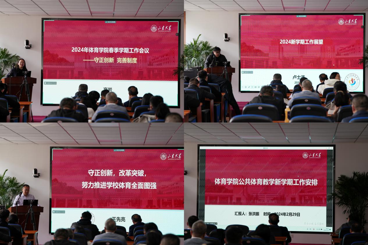 学院分管领导依次对新学期进行安排部署。高岩对学院的人事人才、人才培养以及国际交流合作等工作进行了介绍和安排,强调了本年度规章制度建设的重要性。卢士涌对思政工作、学生工作和教师工作进行了安排部署。王先亮对学科建设、科研工作、群众体育、体育场馆、体质测试等工作进行了安排。张洪振对新学期公体课教学安排、考试办法等进行了安排部署,并对青岛校区体育场馆馆运行情况进行了说明。