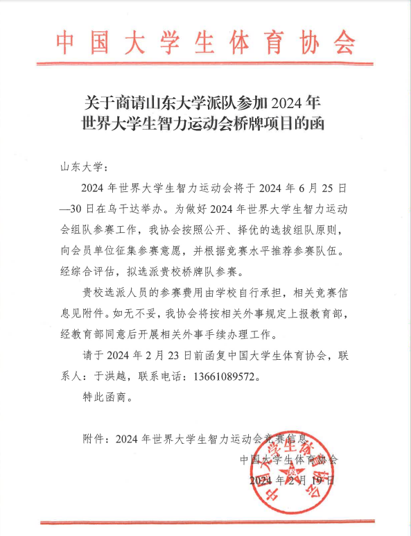 6月25日-6月30日,世界大学生智力运动会将在乌干达恩德培举行,经过中国大学生体育协会的综合选拔,Beat365官方网站桥牌队获得参赛资格,作为桥牌项目的唯一一支中国代表队,将派出4名运动员参加此次比赛。
