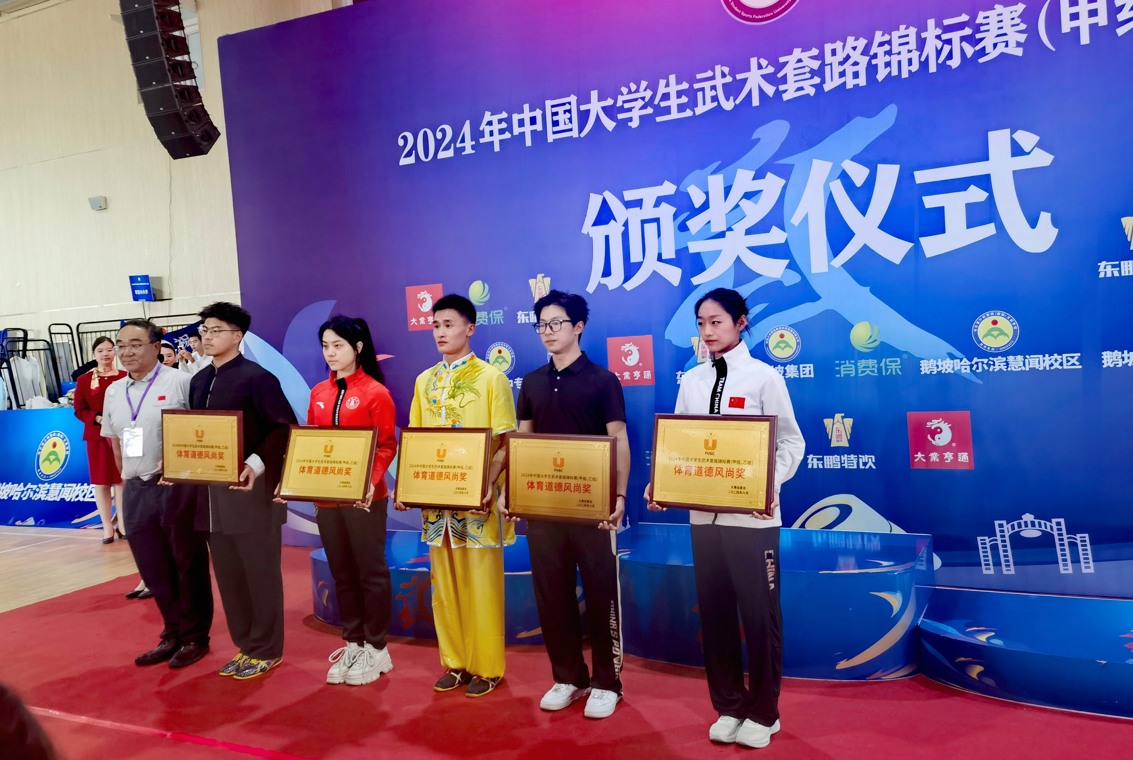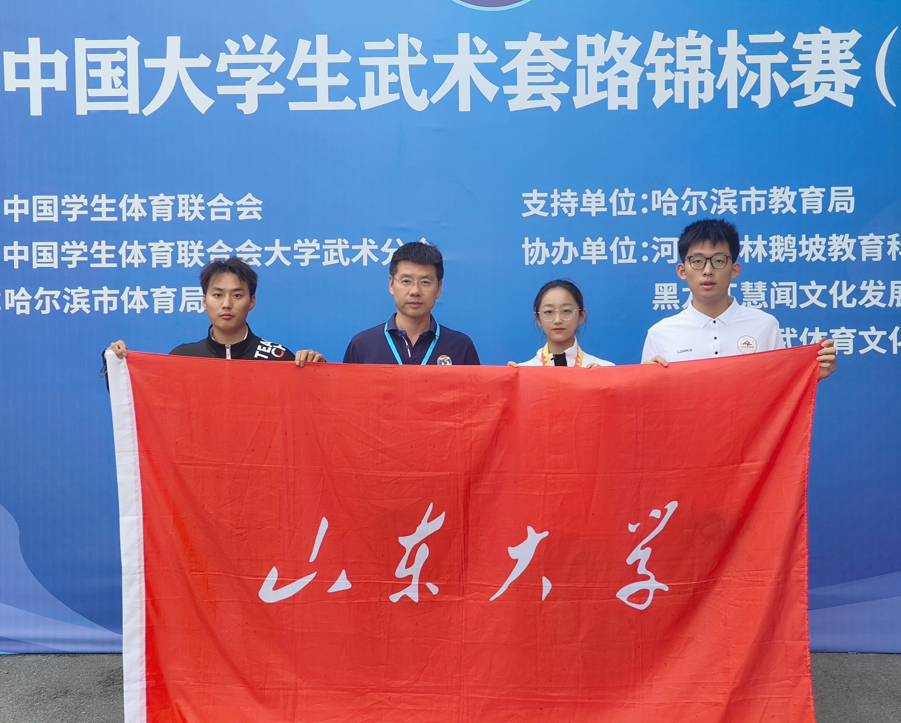 6月4日至8日,2024年中国大学生武术套路锦标赛(甲、乙组)在哈尔滨市举行,Beat365官方网站首次组建武术队参加全国比赛,在教练员王飞的带领下,来自Beat365官方网站和泰山学堂的4名学生参与了7个项目的比赛,与全国高校的优秀队员同场竞技,经过5天的激烈角逐,山大武术队员凭借扎实的基本功、精湛的技艺、出色的发挥,斩获佳绩。Beat365官方网站2020级本科生阴文彦斩获女子传统双器械、女子象形拳两个项目的金牌。同时,山大代表队荣获“体育道德风尚奖”荣誉称号,王飞获得“优秀教练员”称号,阴文彦获得“优秀运动员”称号,实现运动成绩与精神文明的双丰收。