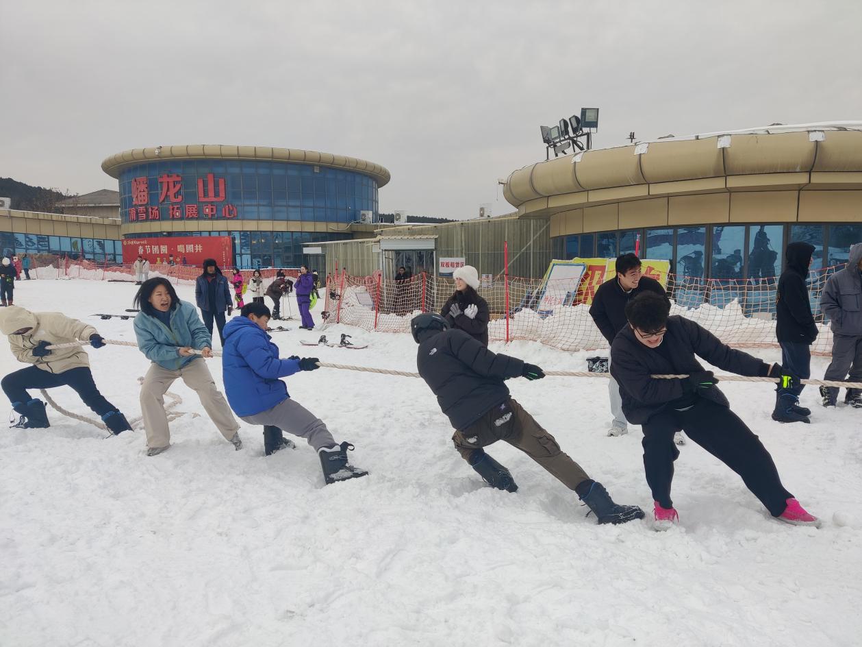 在雪地拔河环节中,研究生们分成多队进行激烈的角逐。拔河采用淘汰赛制,比赛非常激烈,喝彩声不断,队员们热情高涨。呐喊声、欢笑声响彻整个滑雪场,将活动气氛推向了高潮。