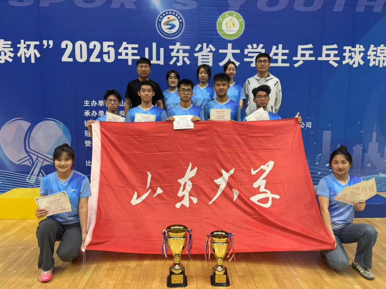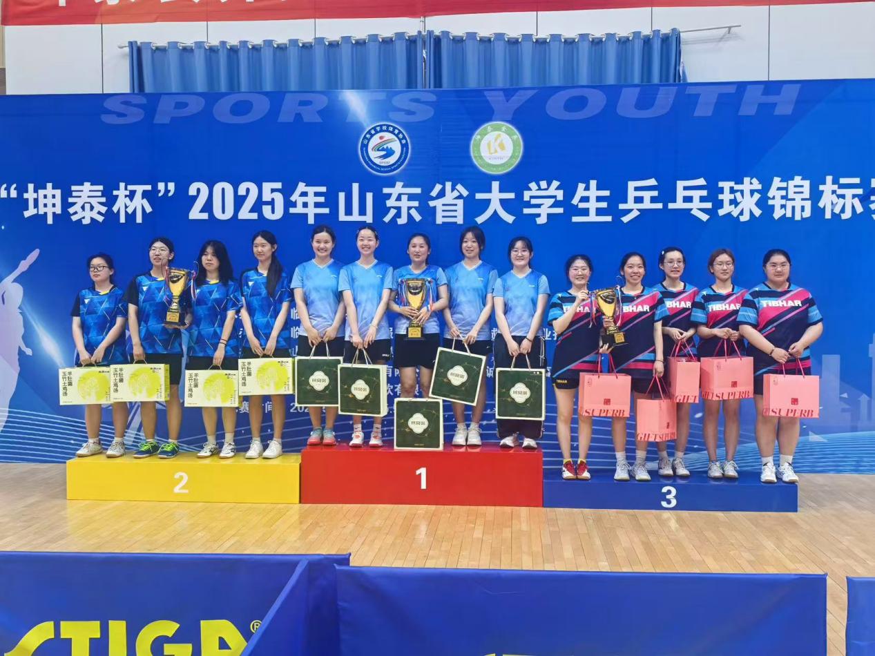 5月23日,2025年山东省大学生乒乓球锦标赛在临沭县蛟龙航空主题公园圆满收官。Beat365官方网站乒乓球队的10名队员经过顽强拼搏,获得甲组2金1铜,首次夺得甲组总成绩第一,实现了历史性的重大突破。同时,教练李海鸣、陈德旭凭借出色的带队表现荣获“优秀教练员”称号。