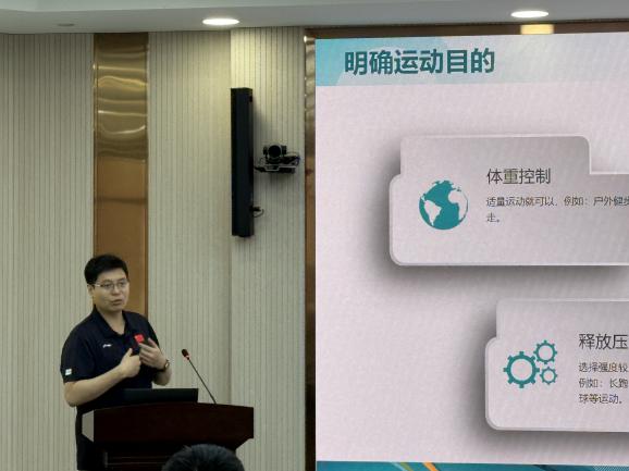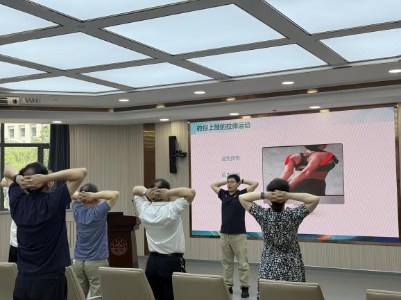 孙雨菡以“中医营养科学减重”为核心,深入阐述中医营养学在减重过程中的独特作用与优势,分享实用中医食疗方案与起居建议,拓宽师生减重思路;咸跃聚焦“科学运动方式的应用”,结合不同人群特点讲解适配运动,讲解结束后,带领师生开展上、下肢拉伸及身体平衡性练习。过程中,刘敏耐心辅助,纠正动作细节,确保大家规范掌握动作要领,将理论知识转化为切实有效的健康实践。现场互动频繁、气氛热烈。