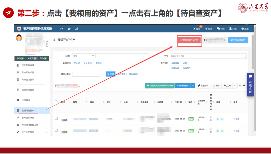 点击【我领用的资产】 →点击右上角的【待自查资产】